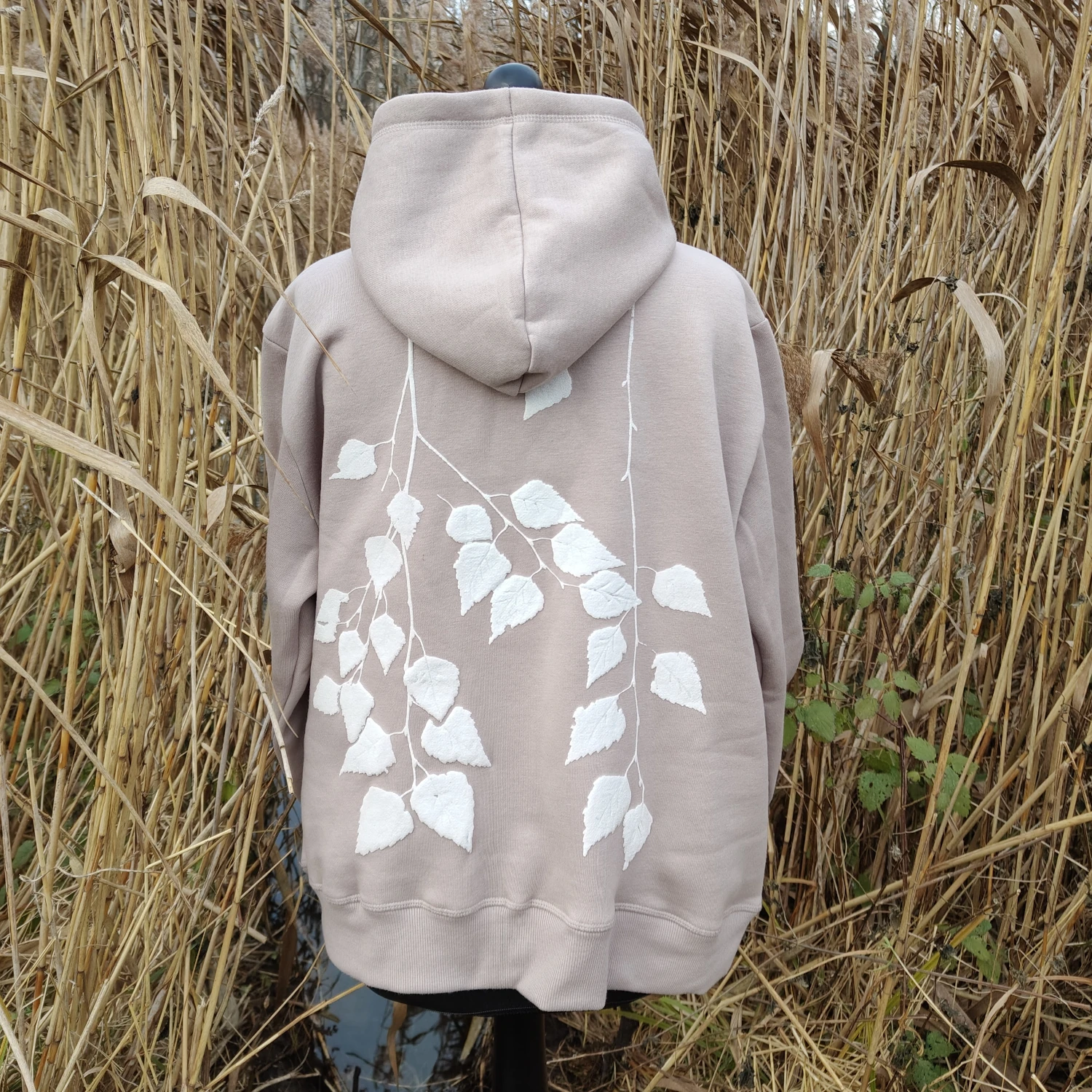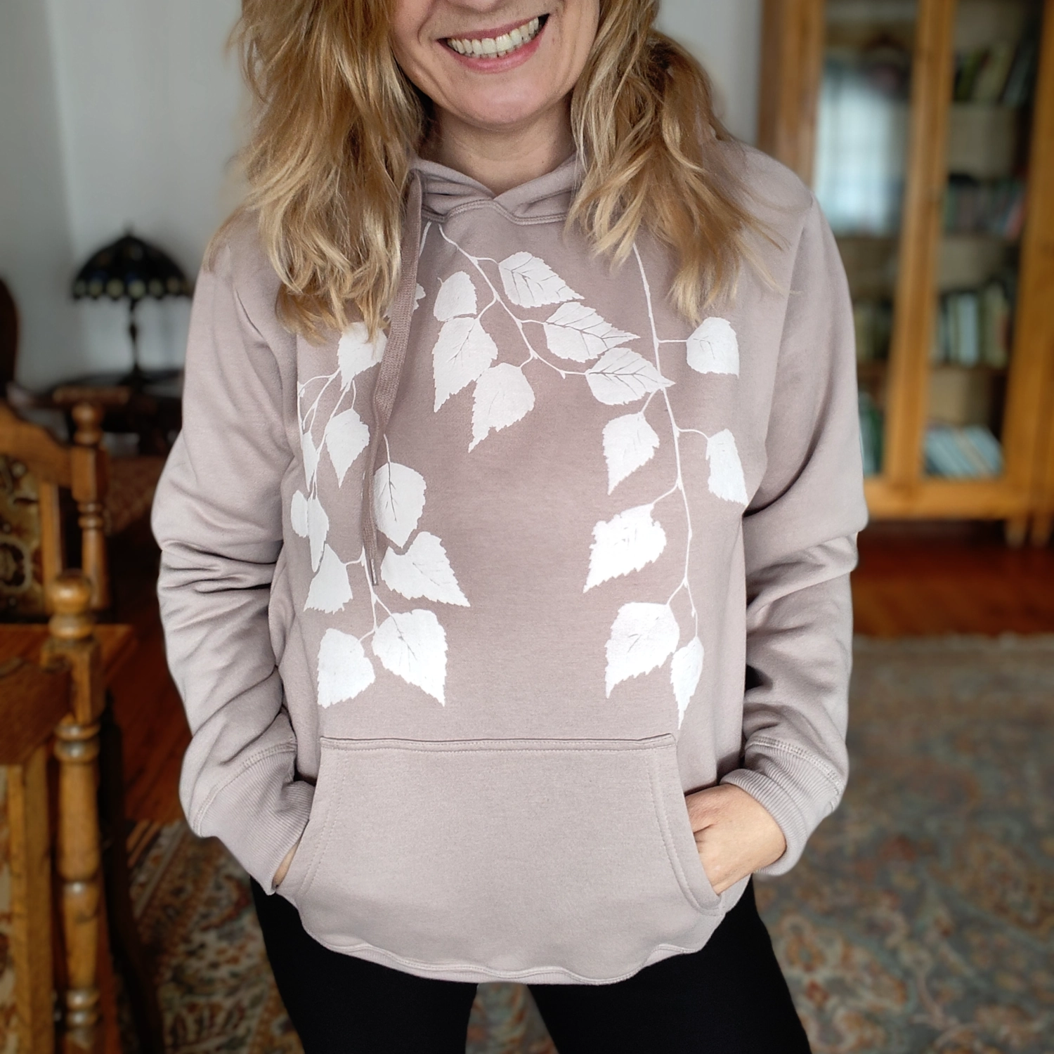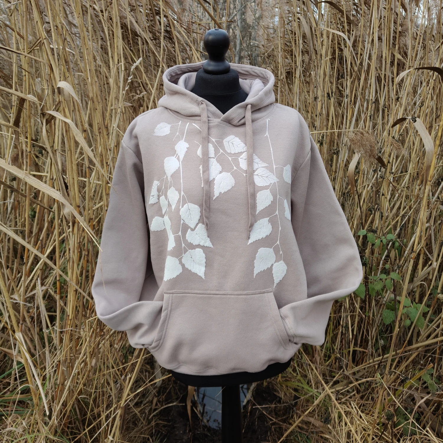 Ciepła, mięsista i lekka bluza z kapturem typu kangurka. Z przodu i z tyłu jest nadruk z listkami brzozy. Coś dla miłośników tych pięknych drzew. Rozmiar: L.
