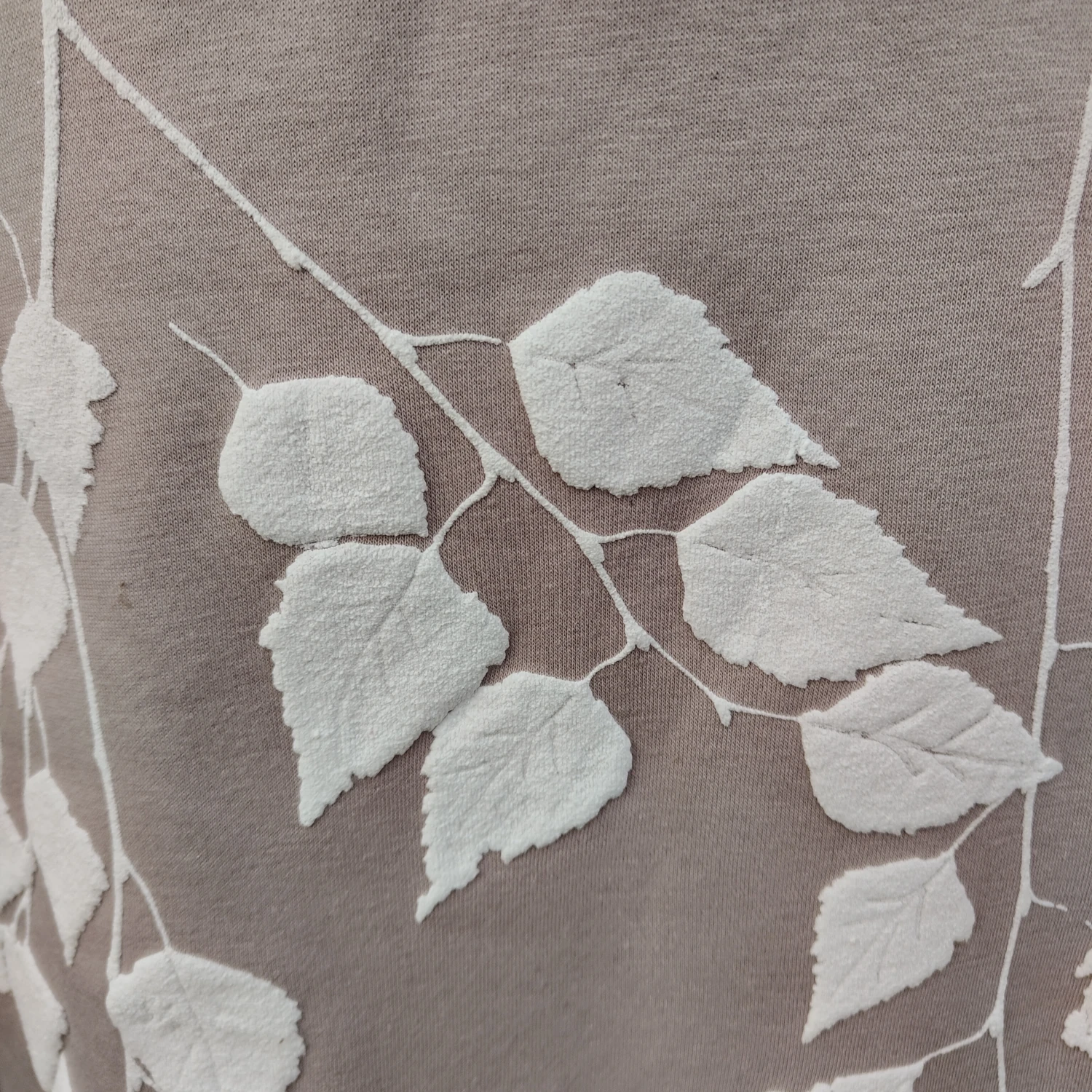 Nadruk zrobiony ręcznie techniką sitodruku farbą puchnącą.