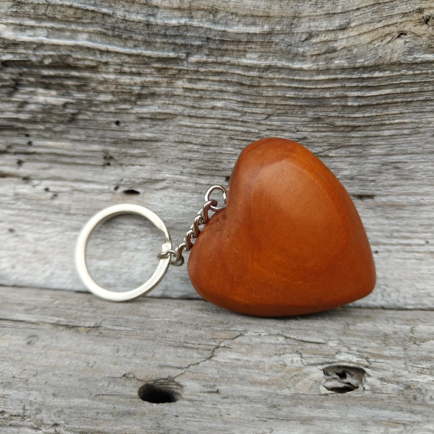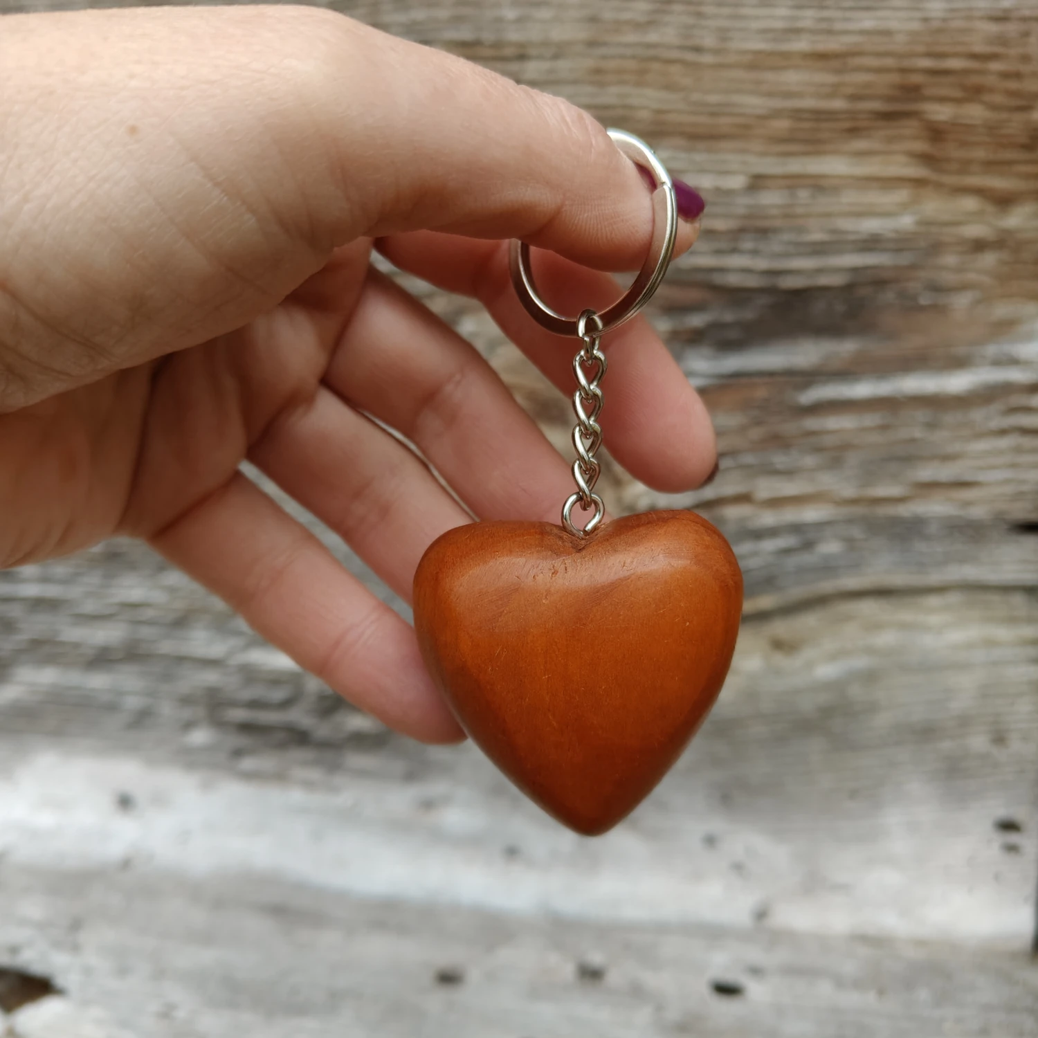Brelok wykonany z drewna w kształcie serca, ręcznie ciosany.