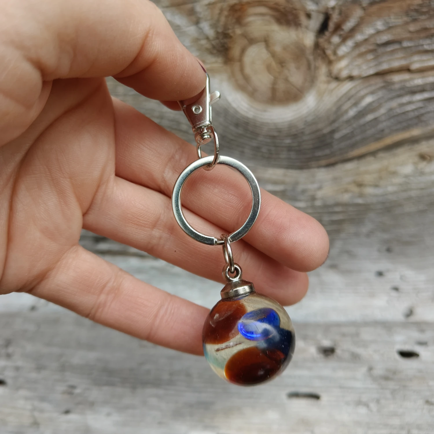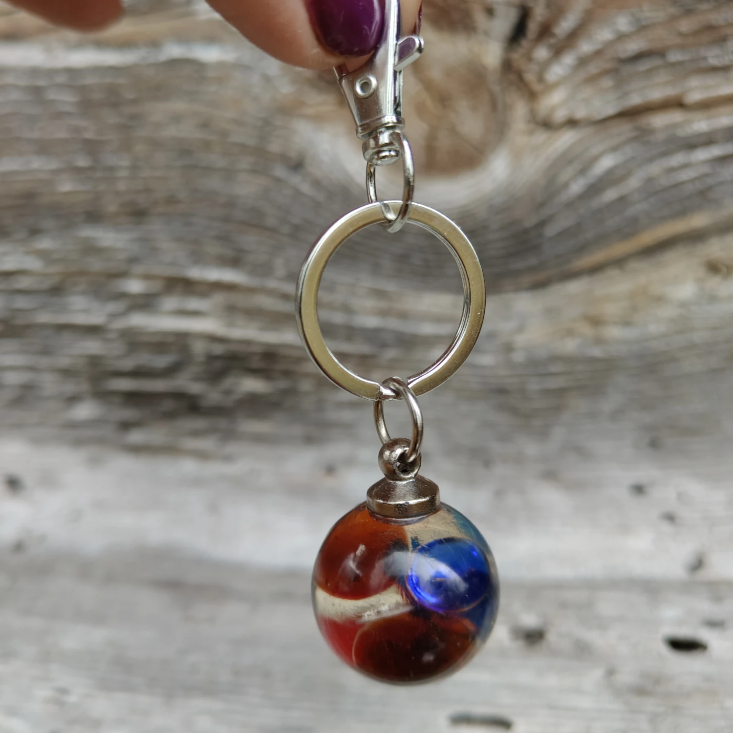 Brelok wykonany z żywicy epoksydowej w kształcie kuli z zatopionymi w niej kroplami kolorowego szkła.