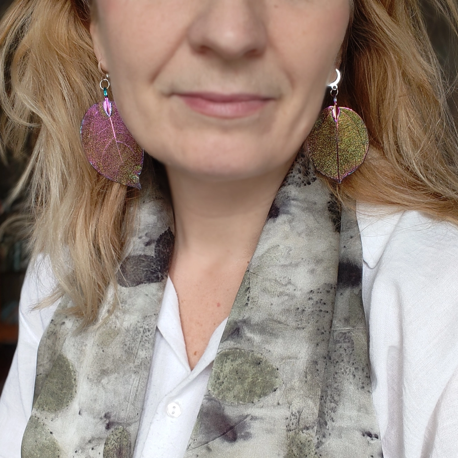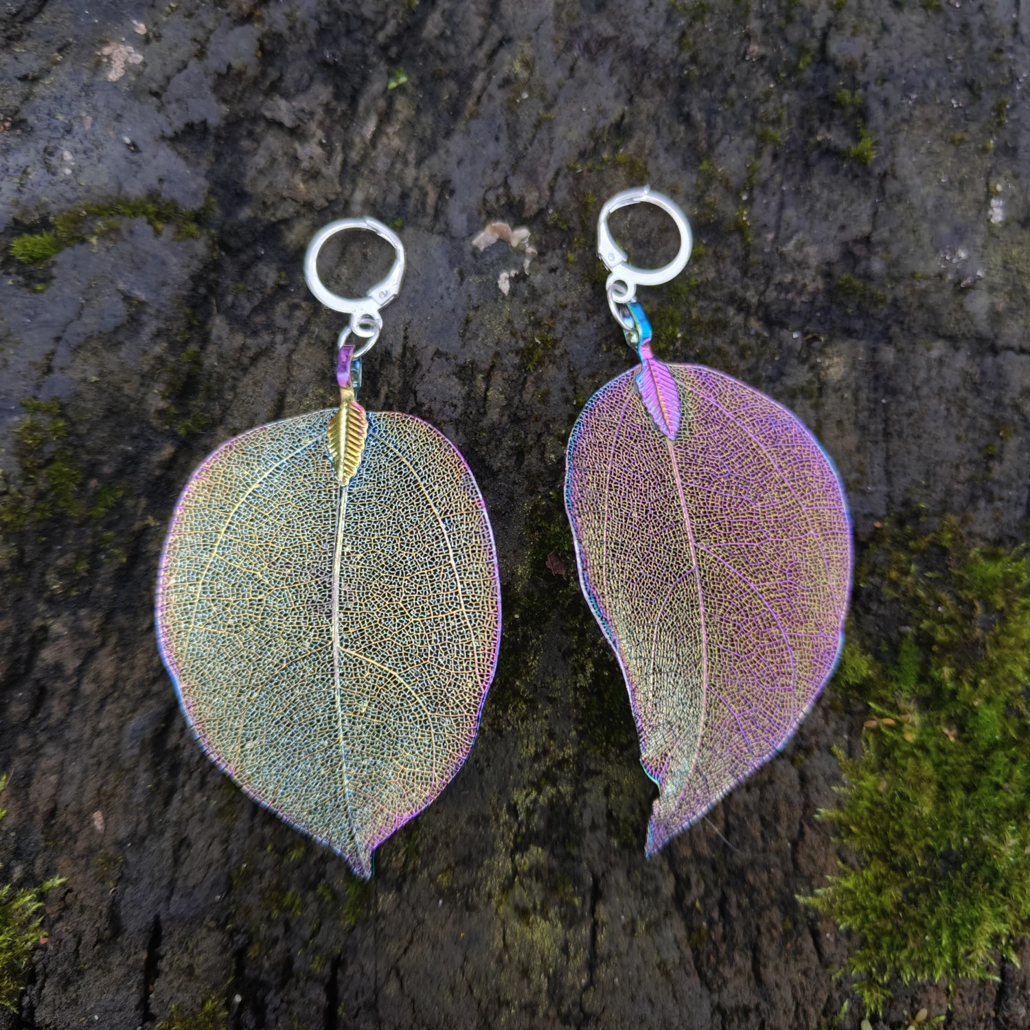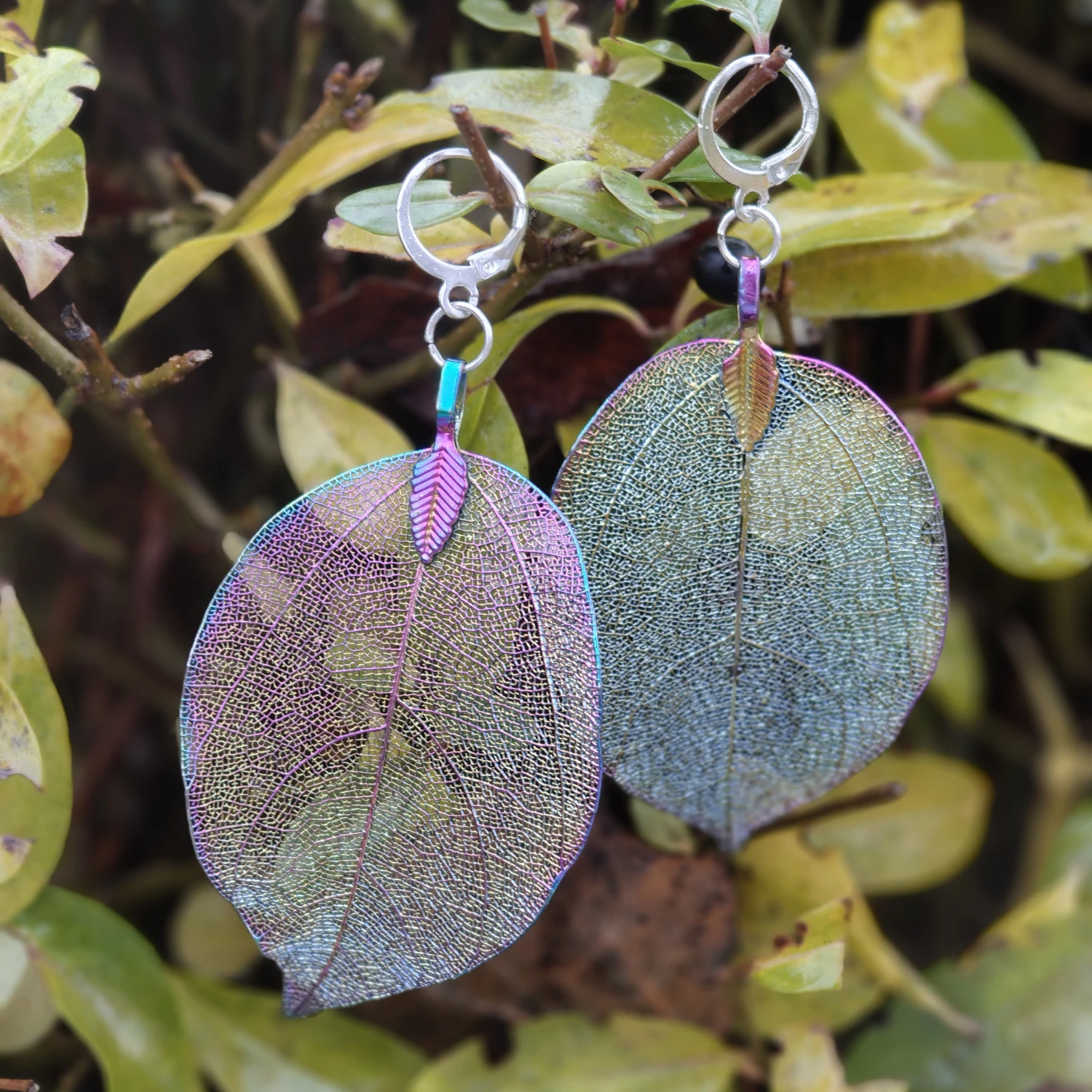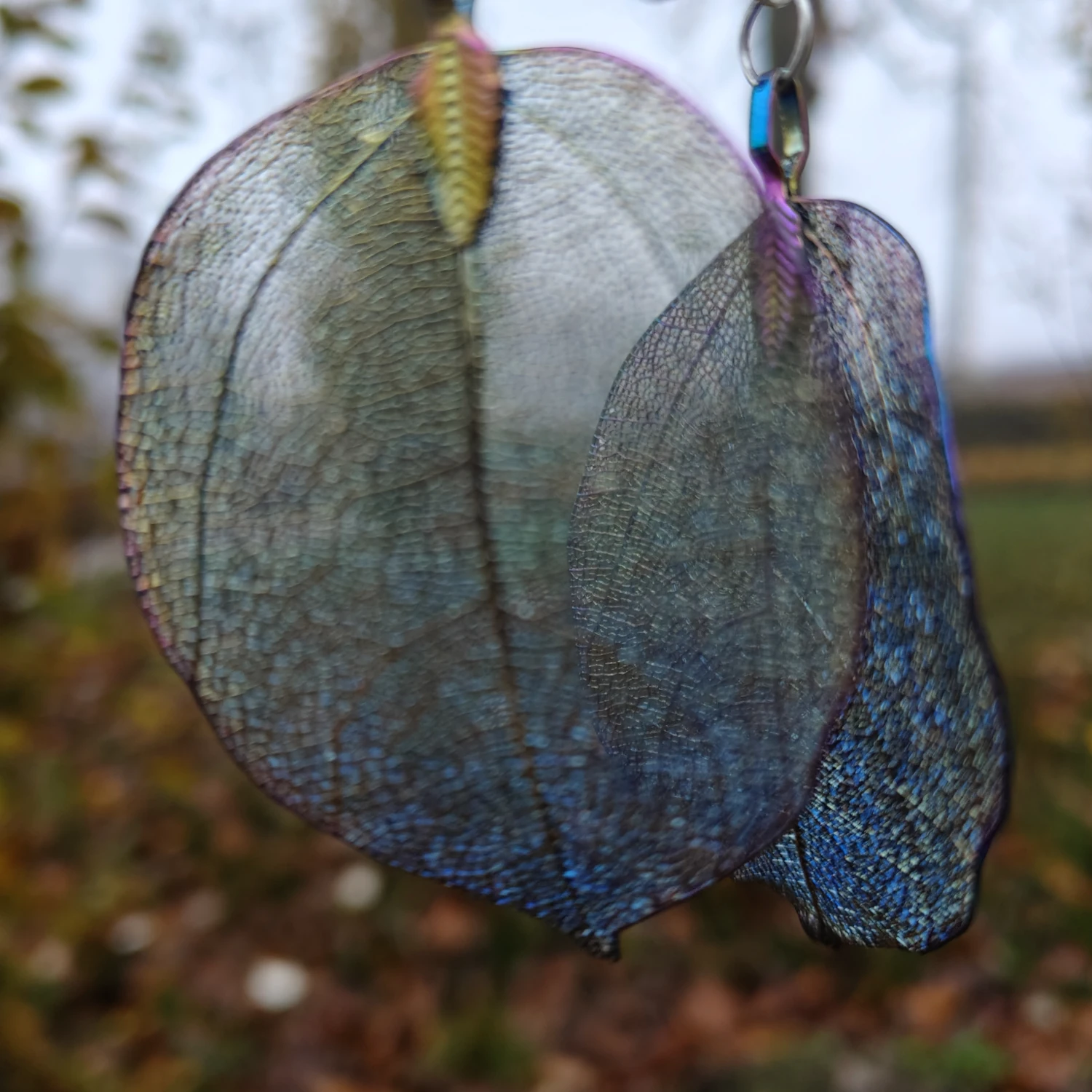Prawdziwe liście z usuniętymi blaszkami poddane procesowi galwanizacji i naniesienia tytanu. Kolczyki mieniące się barwami od turkusu, poprzez fiolet do złota…