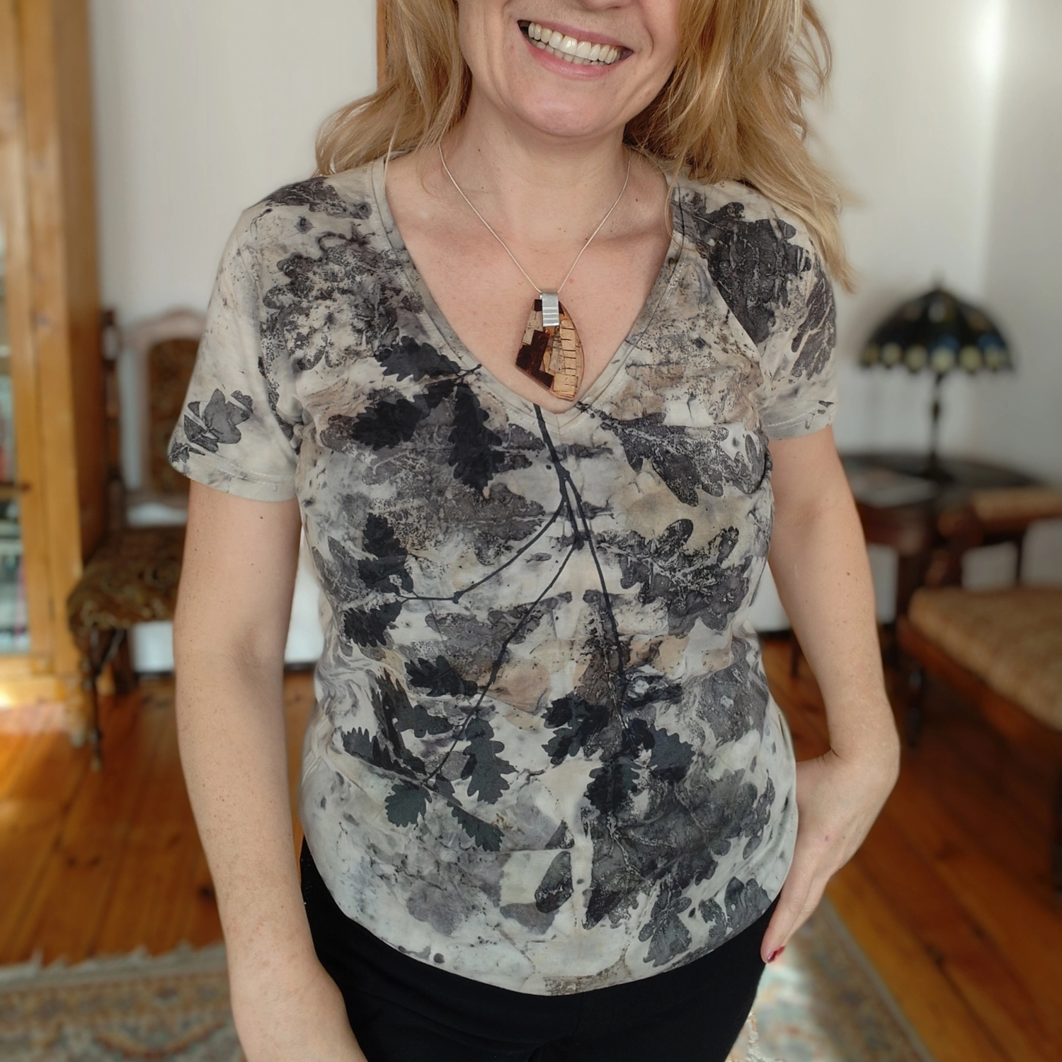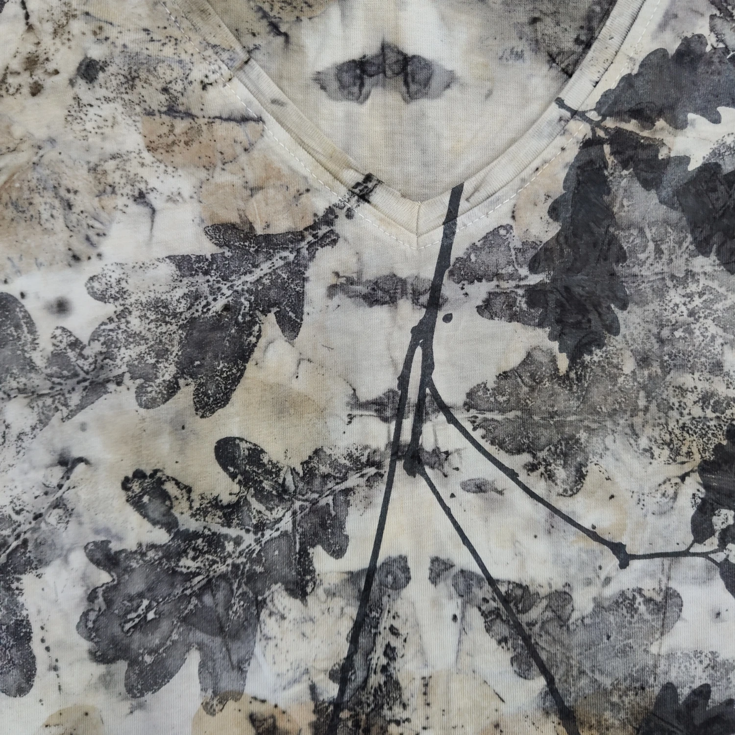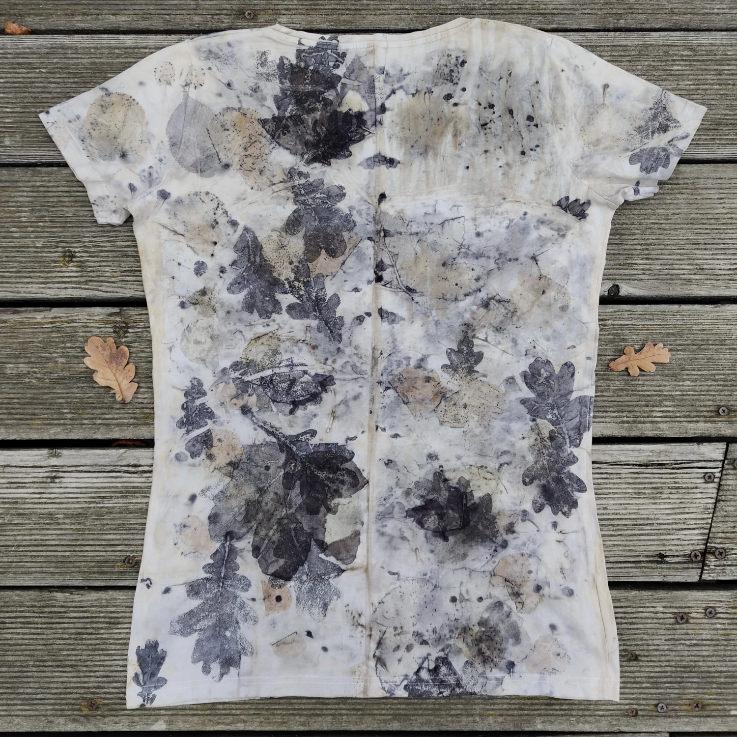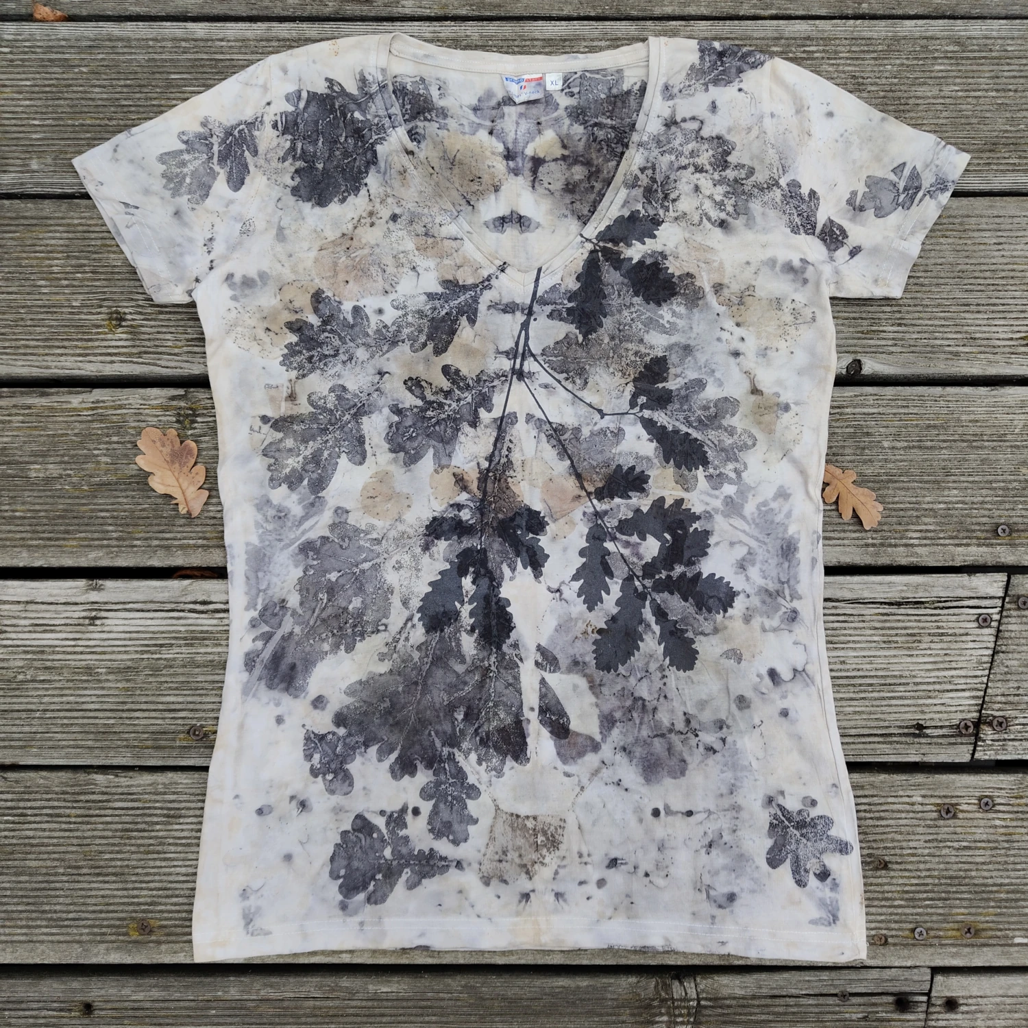 Oryginalna i wyjątkowa koszulka wykonana techniką ecoprintingu z liśćmi dębu i eukaliptusa oraz z sitodrukiem. Rozmiar: XL.