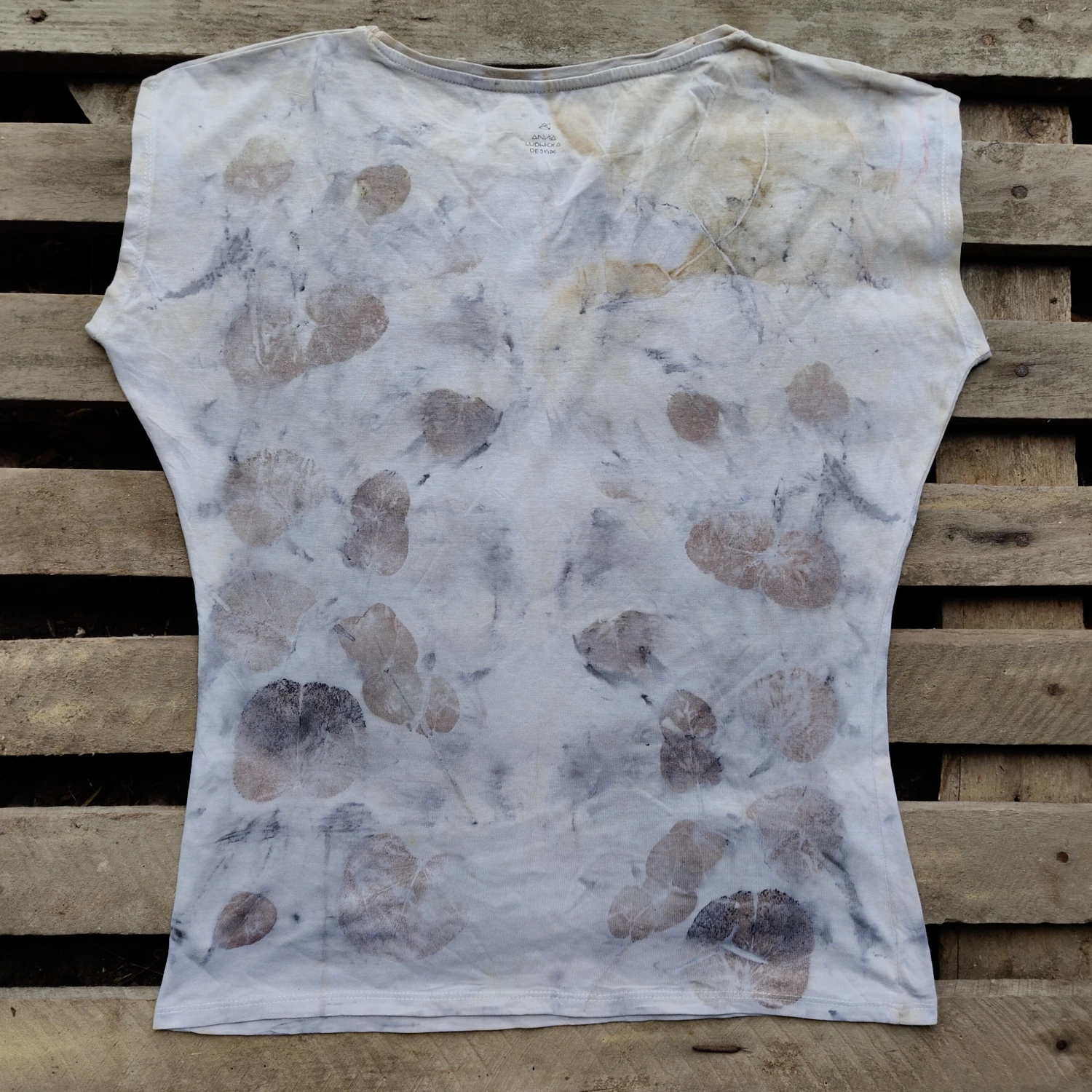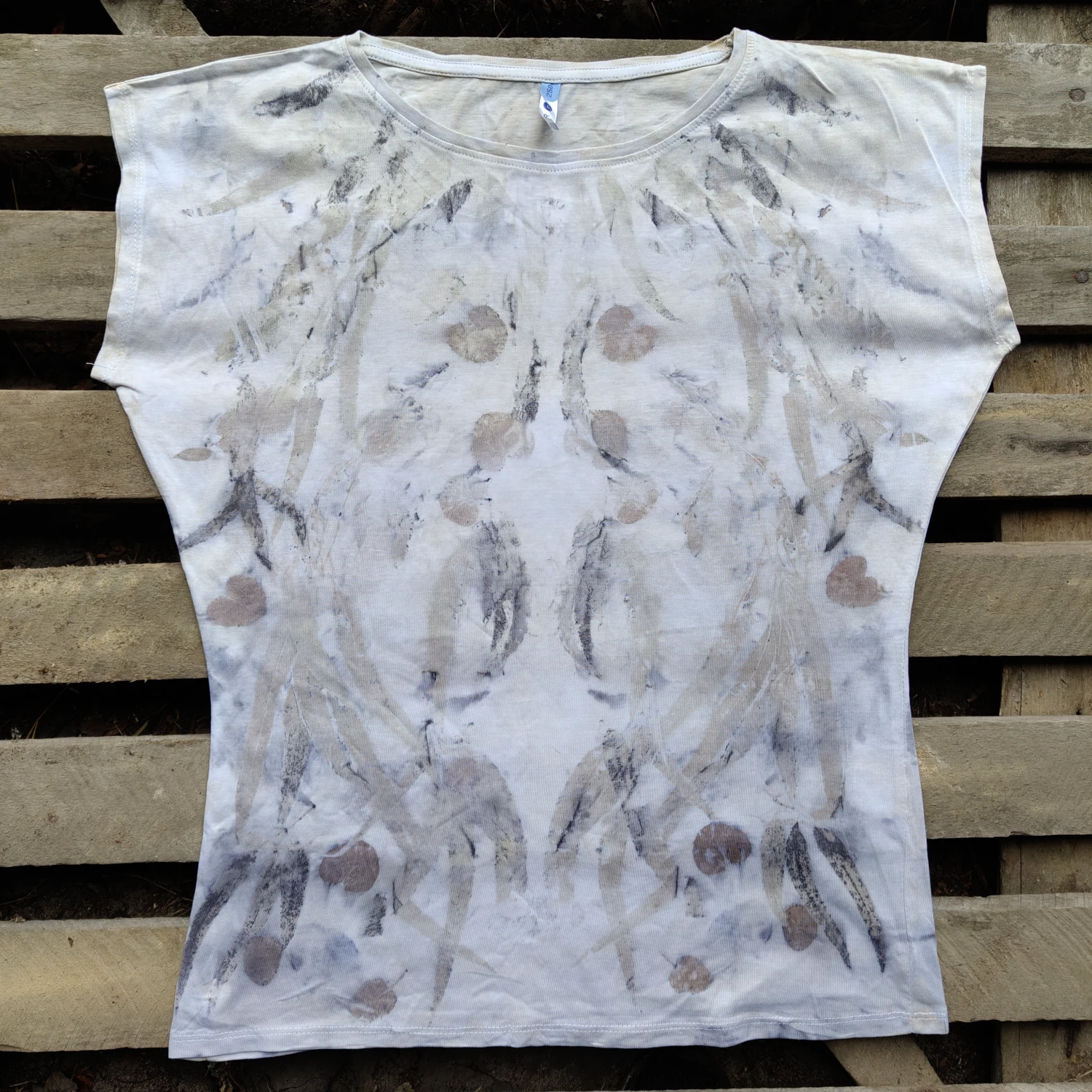 Oryginalna i stylowa koszulka, z odbiciami różnych rodzajów liści eukaliptusa. Delikatna i stylowa, pasująca do wielu stylizacji. Rozmiar: L.