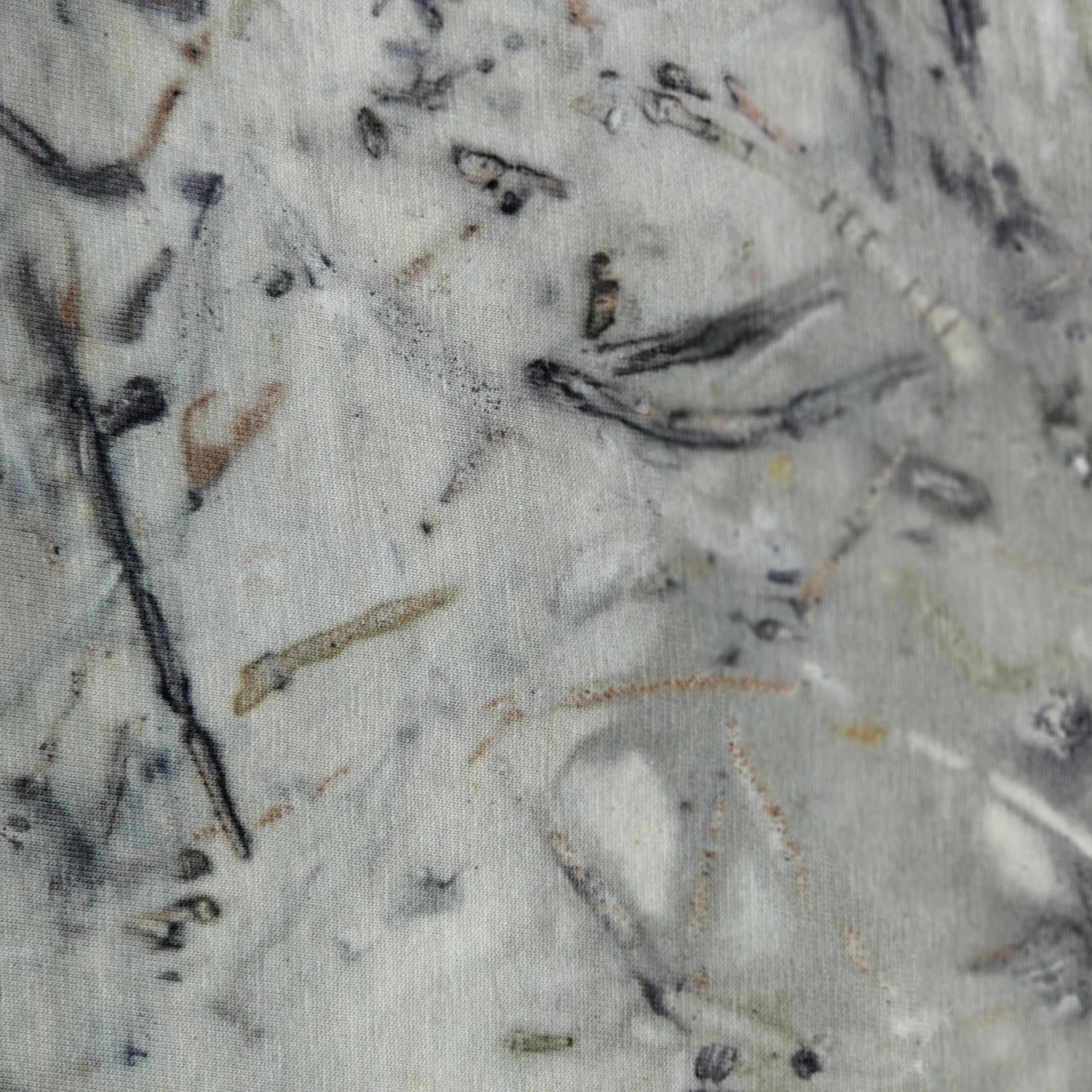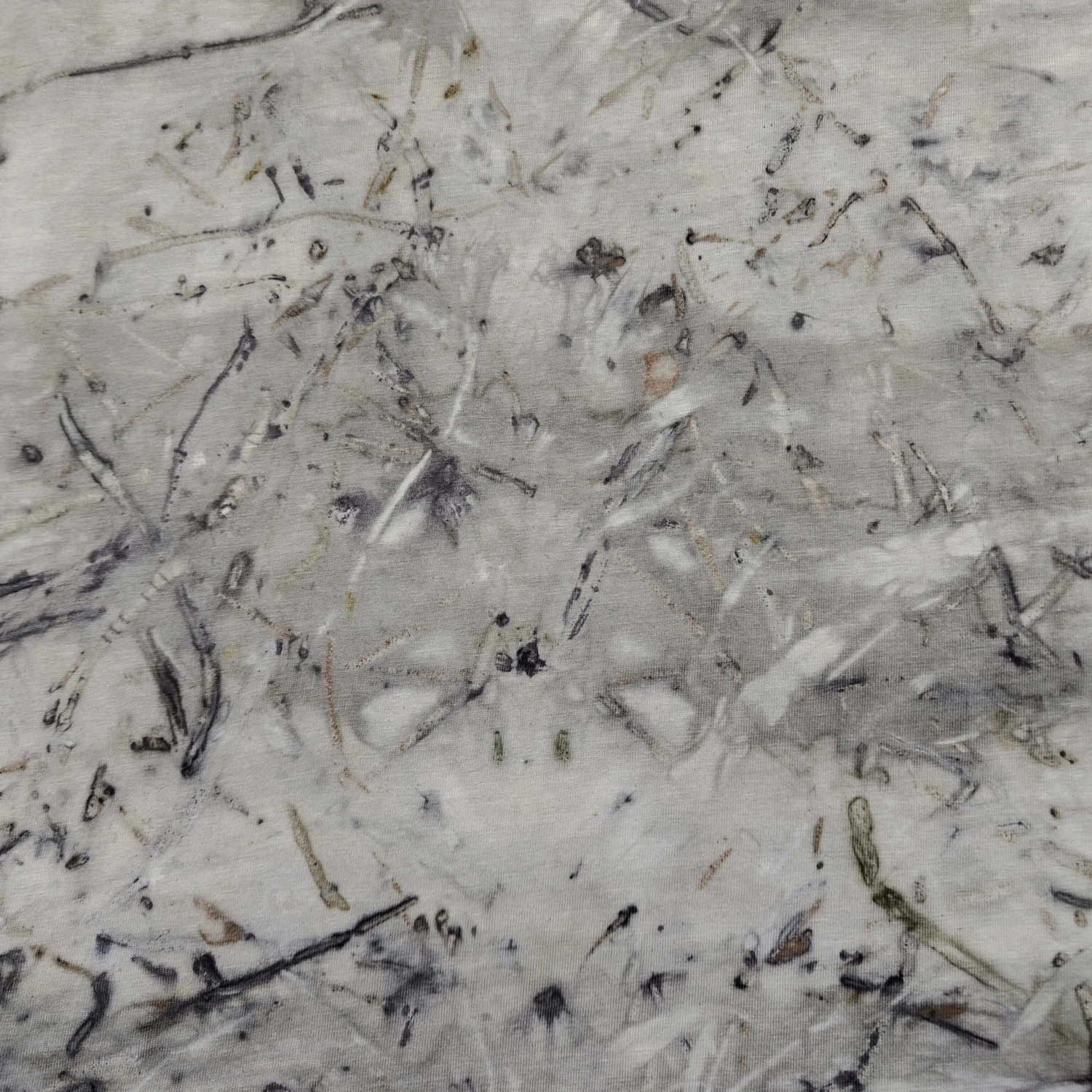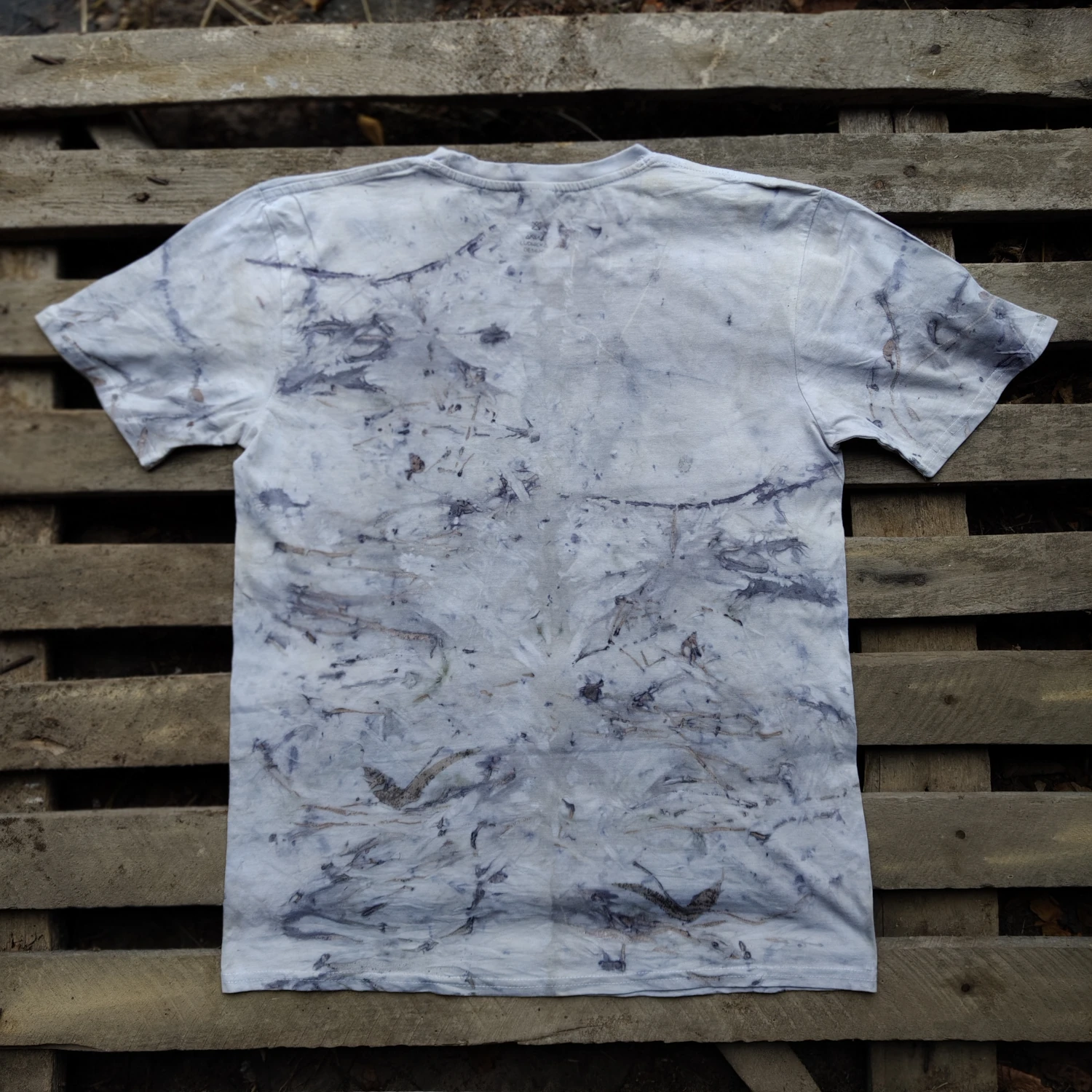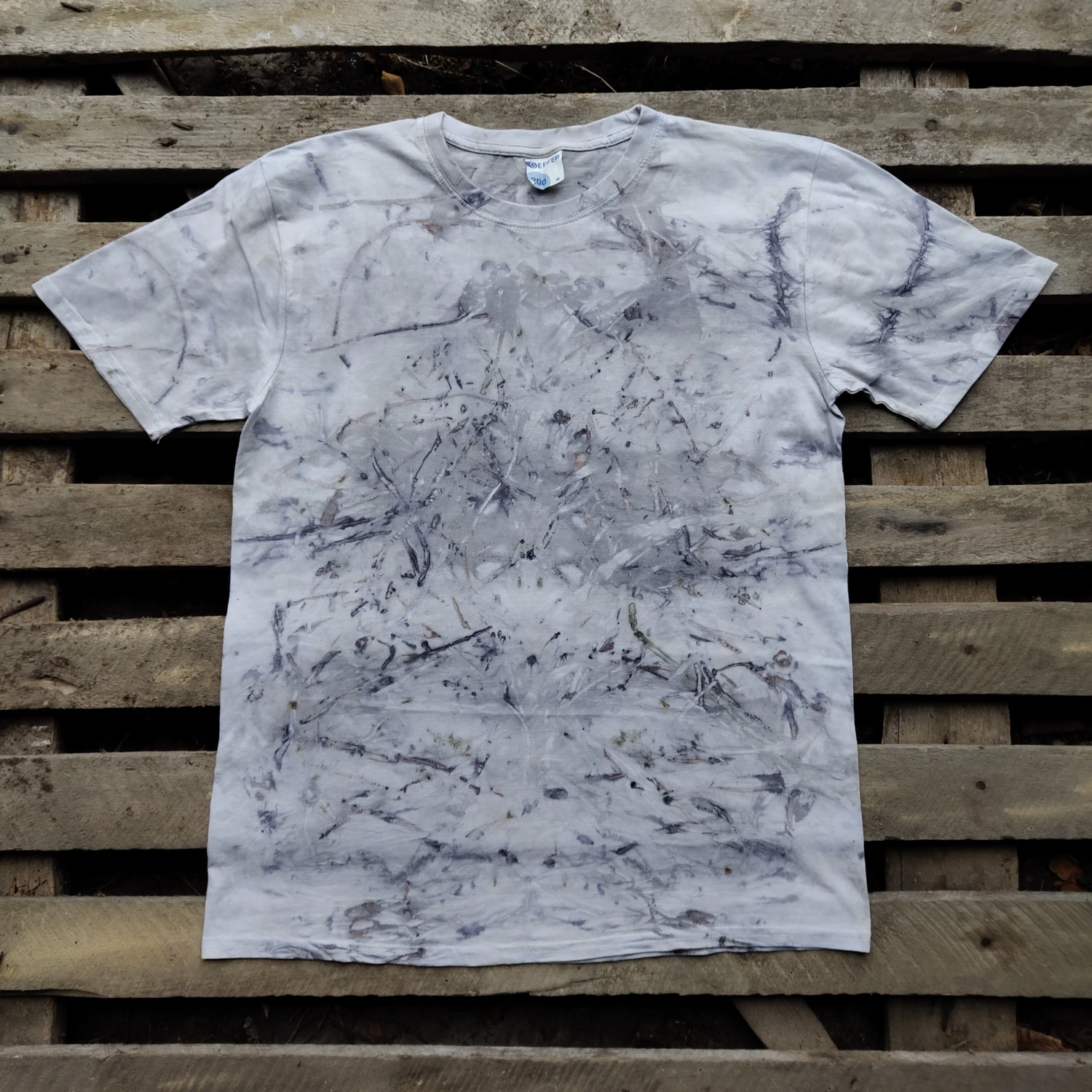 Oryginalna i niepowtarzalna koszulka z ecoprintem łodyg eukaliptusa, w różnych odcieniach szarości. Rozmiar: M.