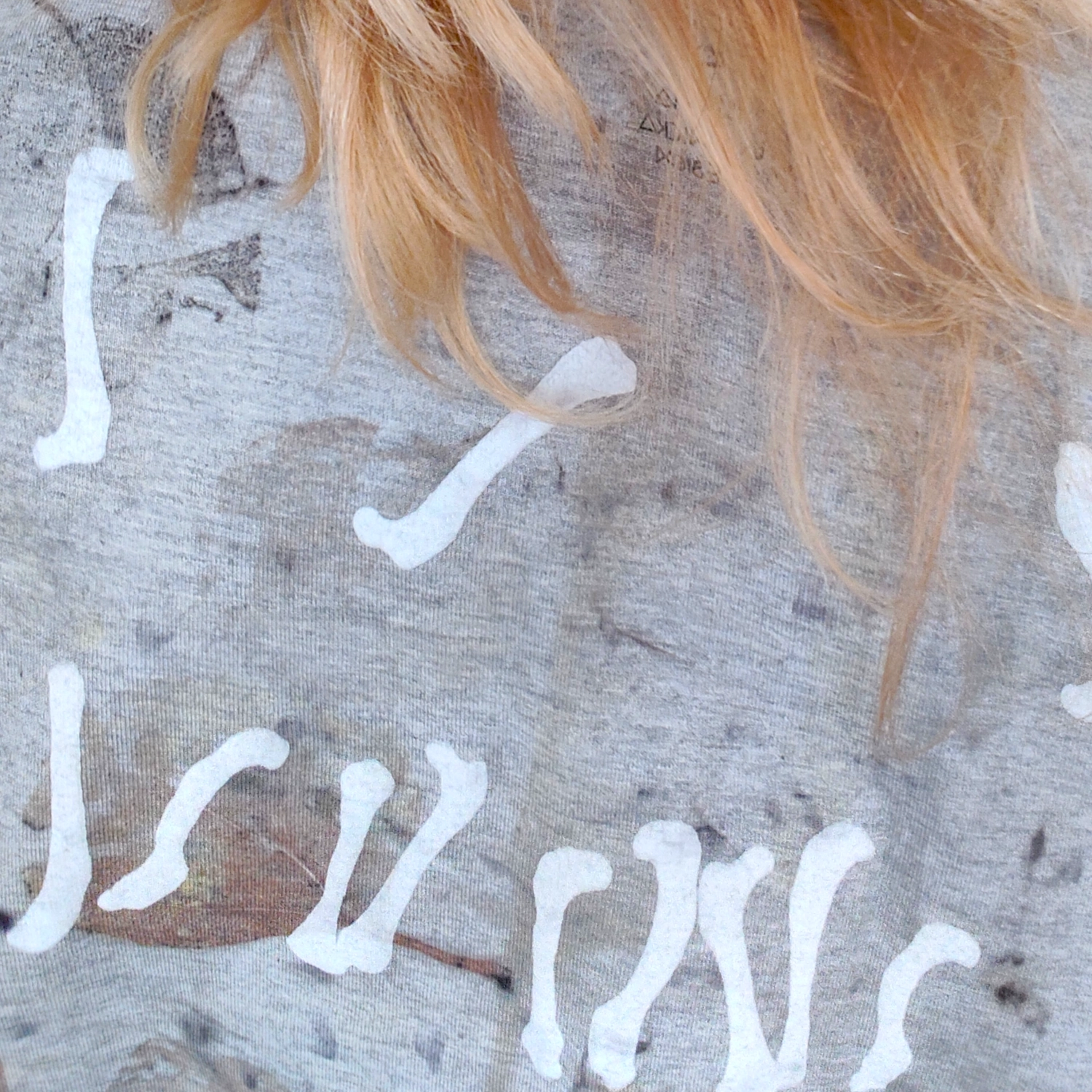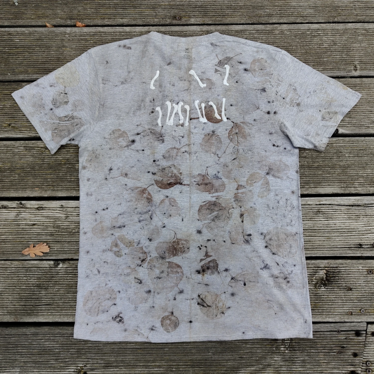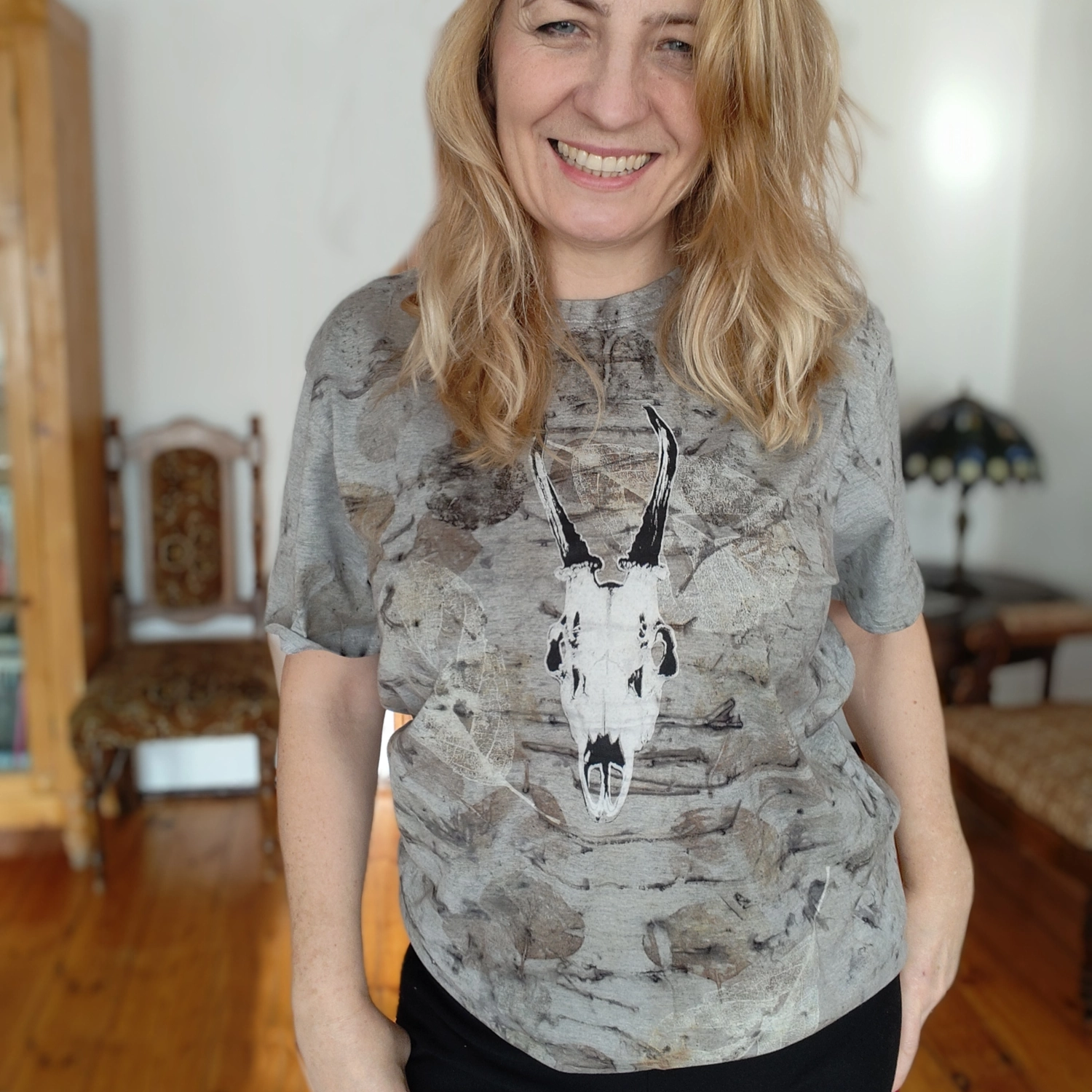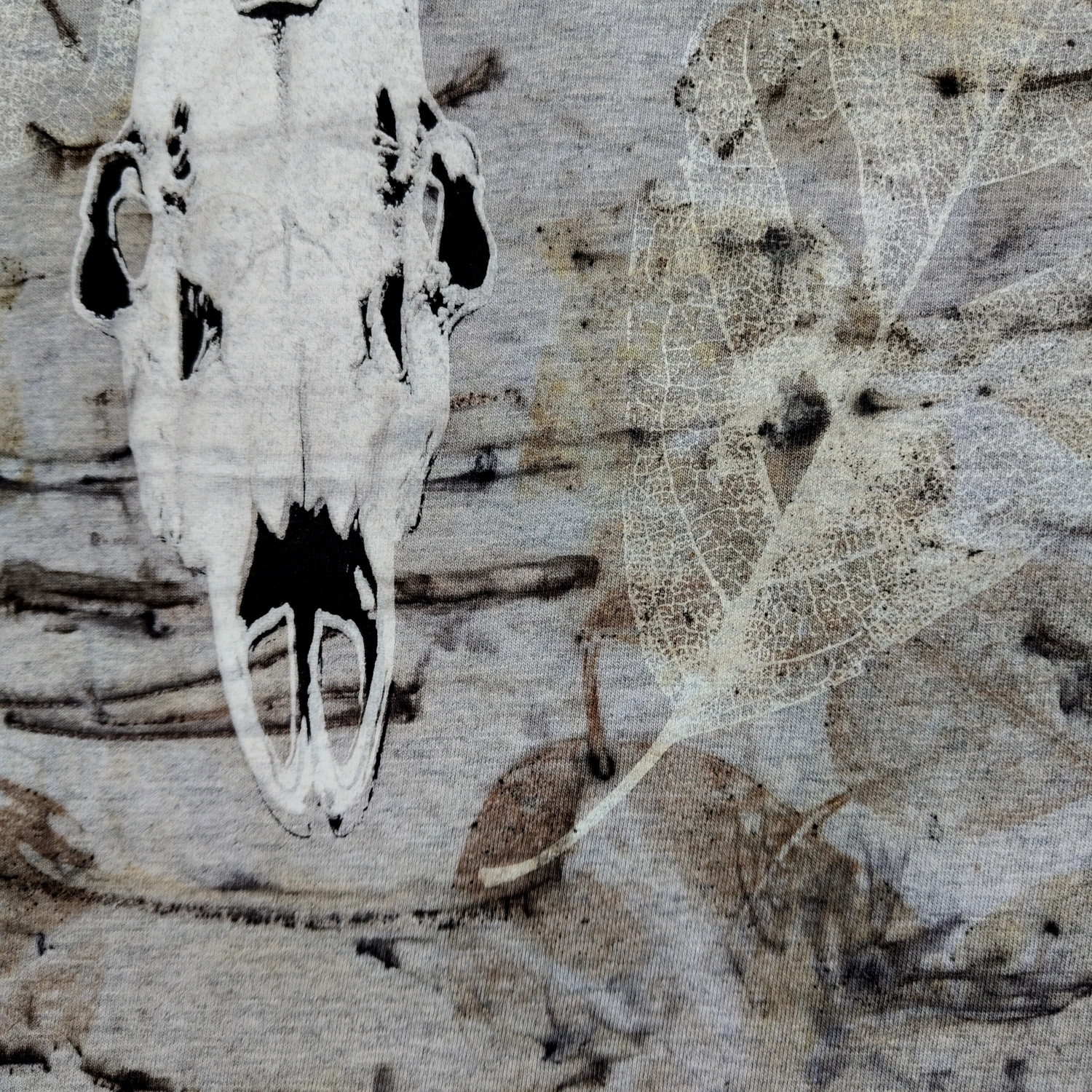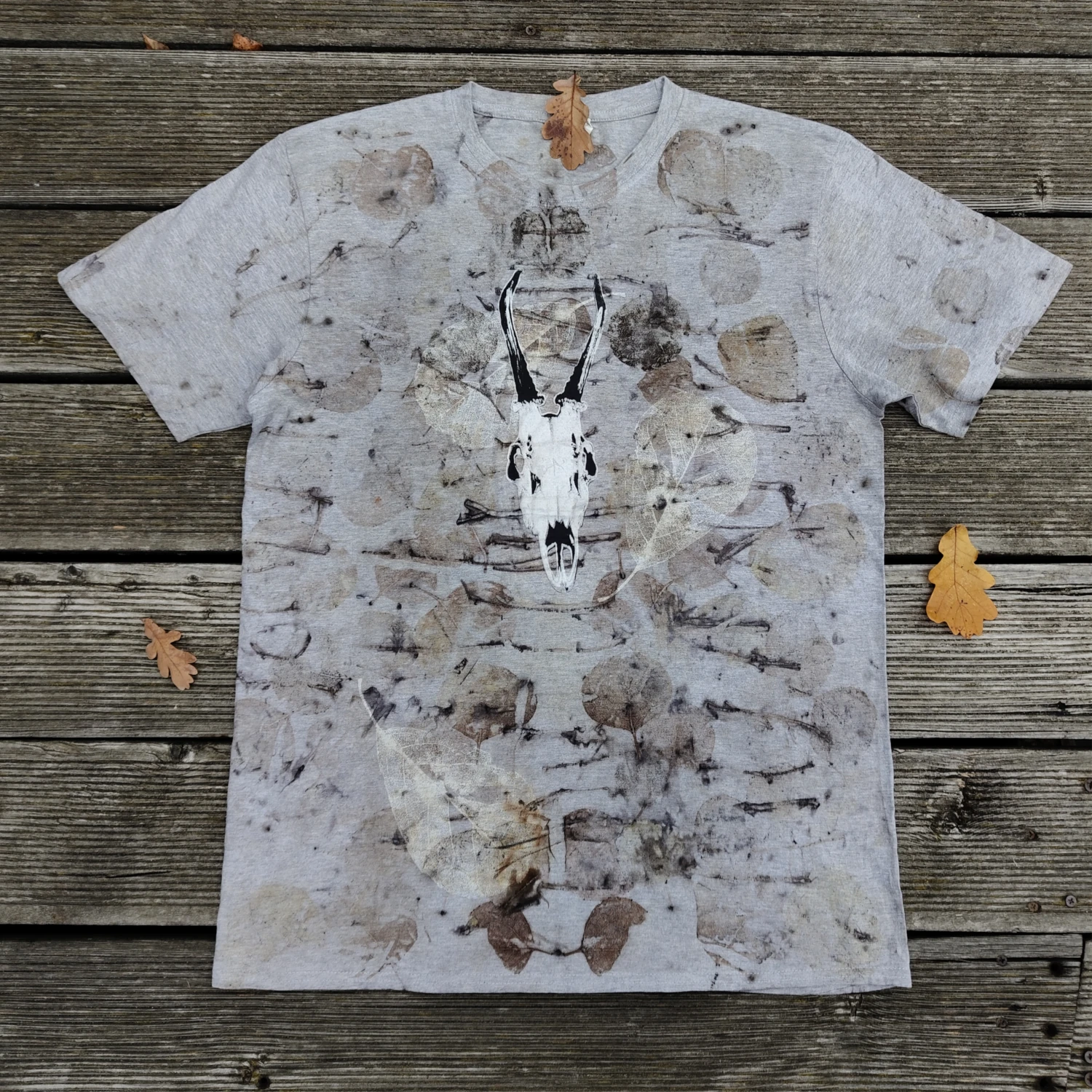 Metryczka, czyli jakich liści użyłam: łodygi i liście eukaliptusa + sitodruk z czaszką sarny, liśćmi i kostkami