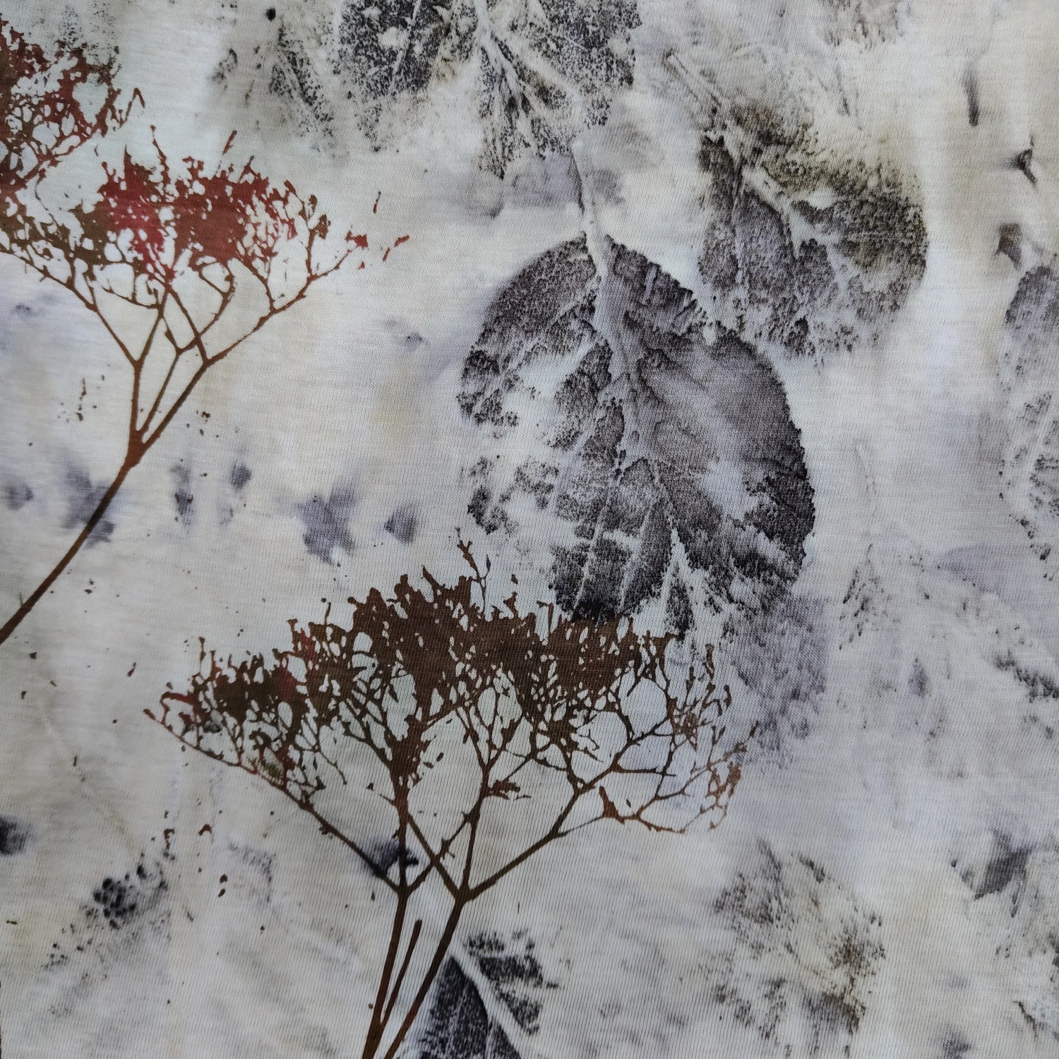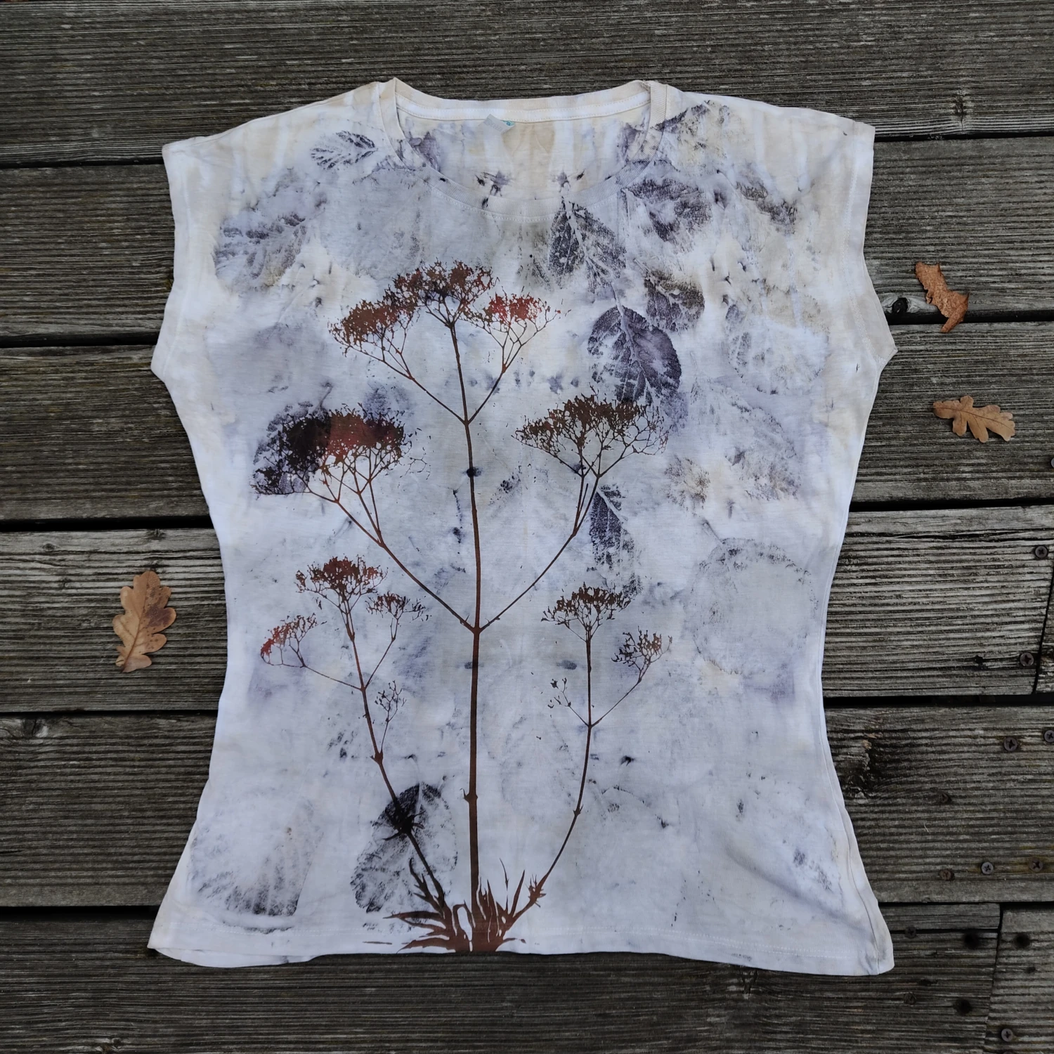 Oryginalna i ciekawa koszulka z odbiciami liści olchy i sitodrukiem z ciekawym kształtem rośliny polnej. Rozmiar: XL.