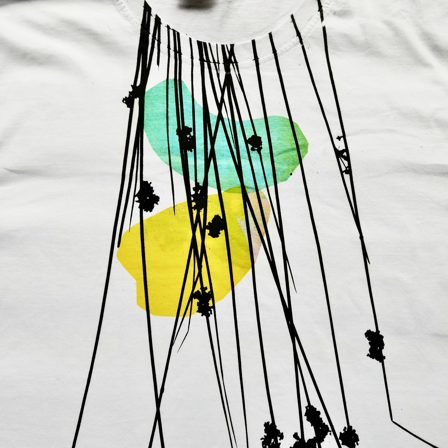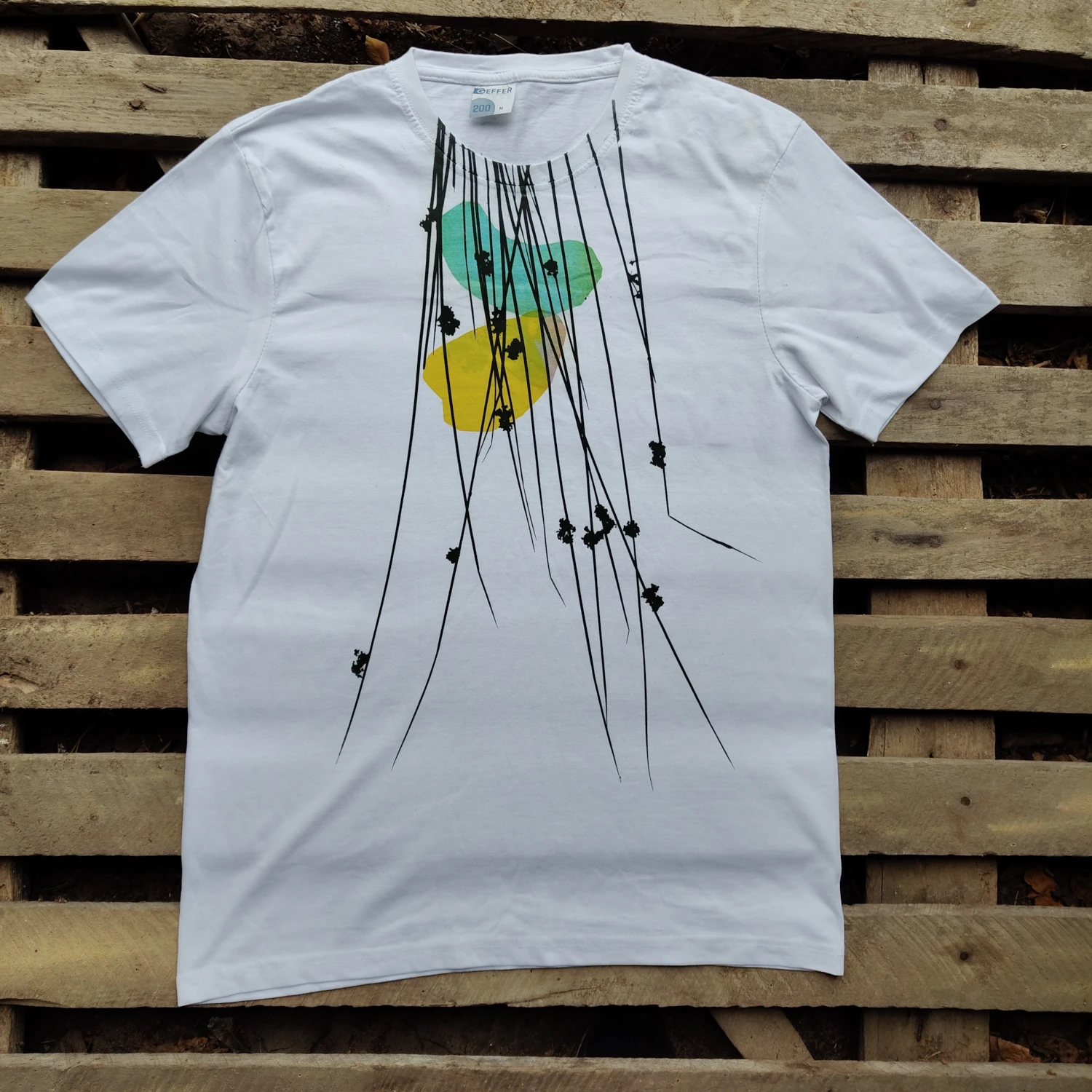 Oryginalna i delikatna koszulka z sitodrukiem. Nadruk przedstawia sitowie z kolorowymi plamami. Rozmiar: M.