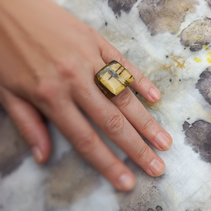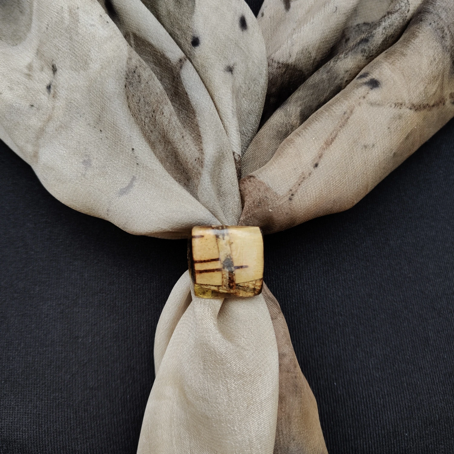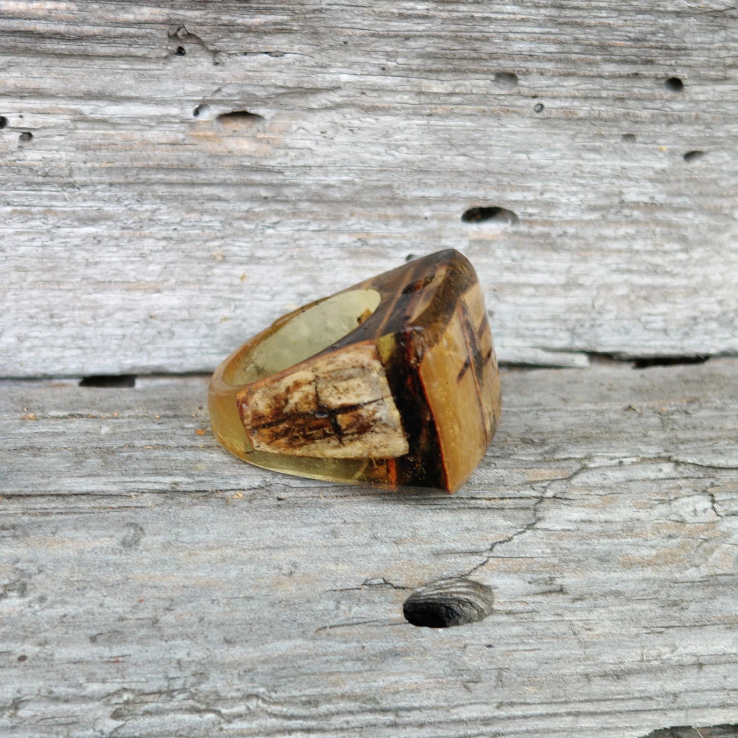 Unikatowy pierścień wykonany z żywicy epoksydowej z zatopioną korą brzozy. Może być ozdobą dłoni jak i może służyć do łączenia szala lub chusty pod szyją. Ręcznie robiony.