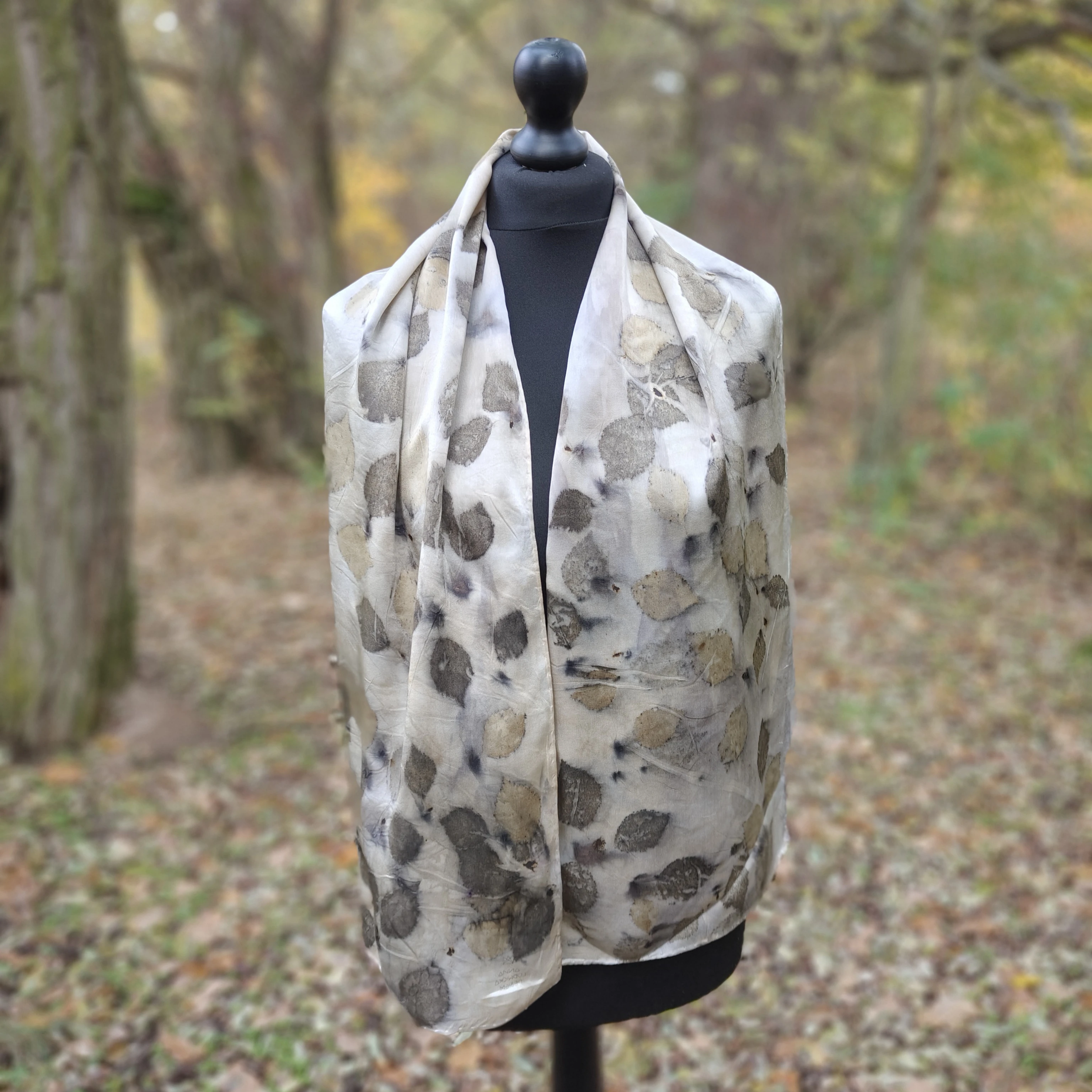 Wyjątkowy szal wykonany w 100% z jedwabiu naturalnego z ecoprintem z brzozowymi liśćmi. Poczuj bliskość Natury.
