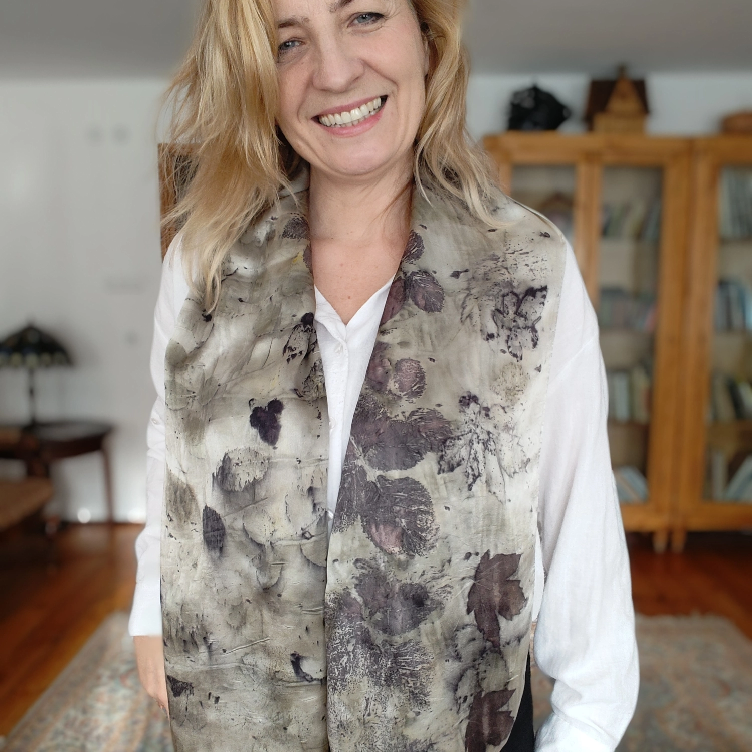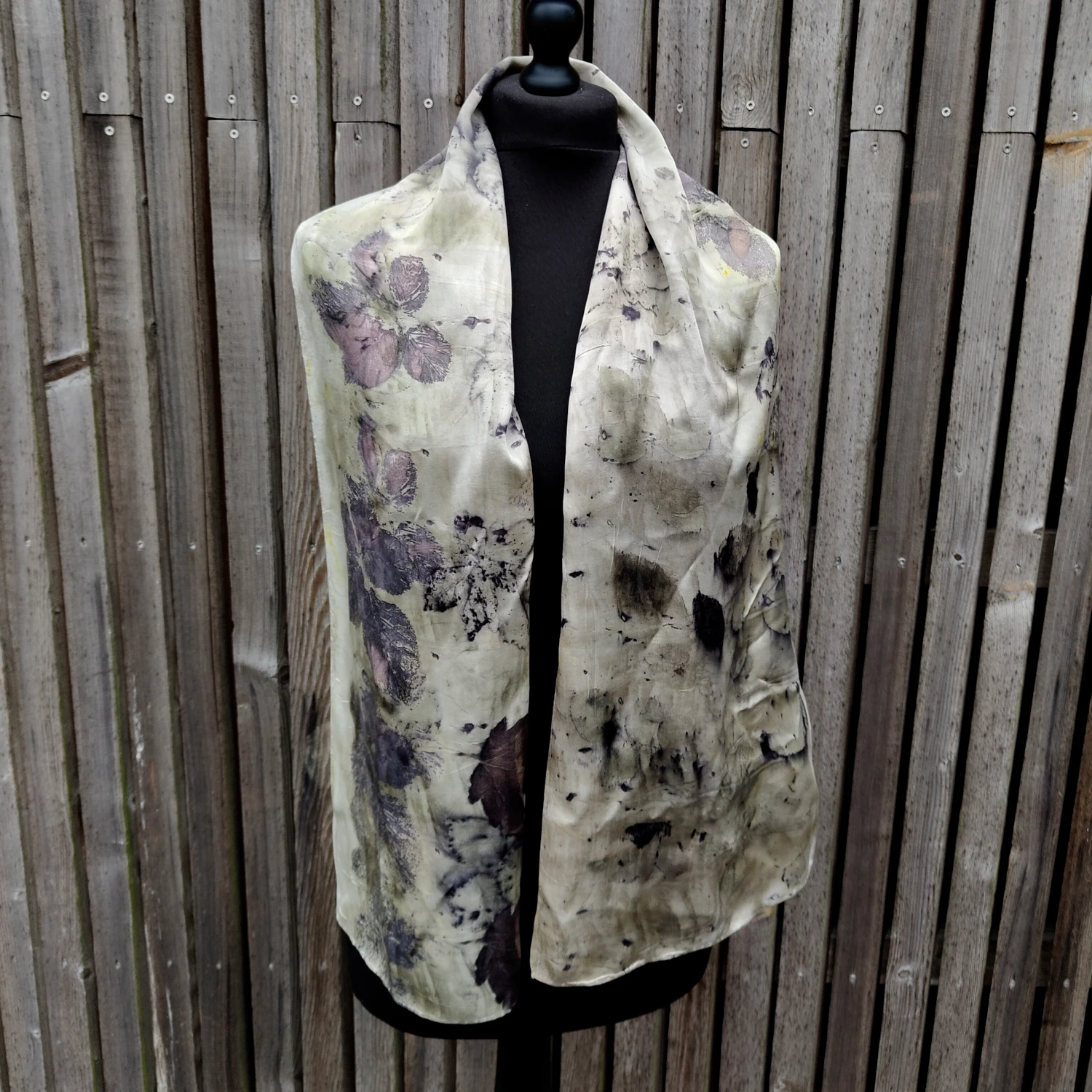 Wyjątkowy szal wykonany w 100% z jedwabiu naturalnego z ecoprintem z jeżyną, różą i jaworem. Poczuj się wyjątkowo!
