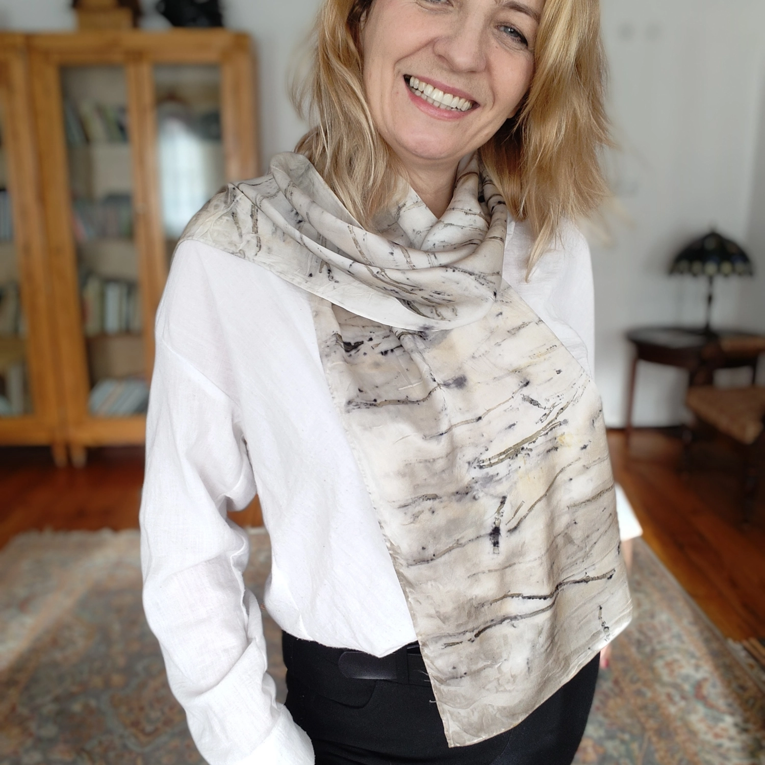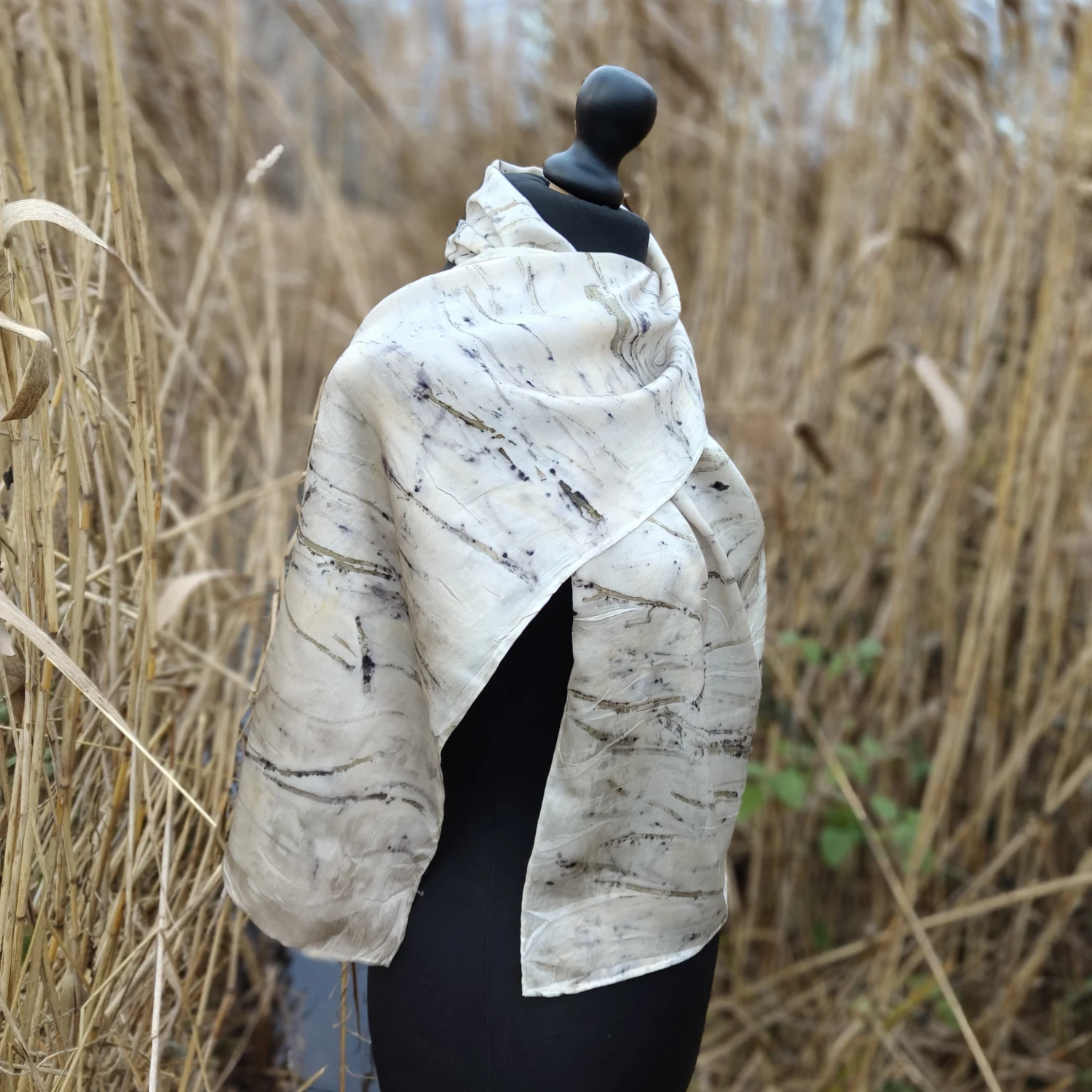 Wyjątkowy szal wykonany w 100% z jedwabiu naturalnego z ecoprintem z łodyżkami eukaliptusa. Poczuj się wyjątkowo i pięknie!