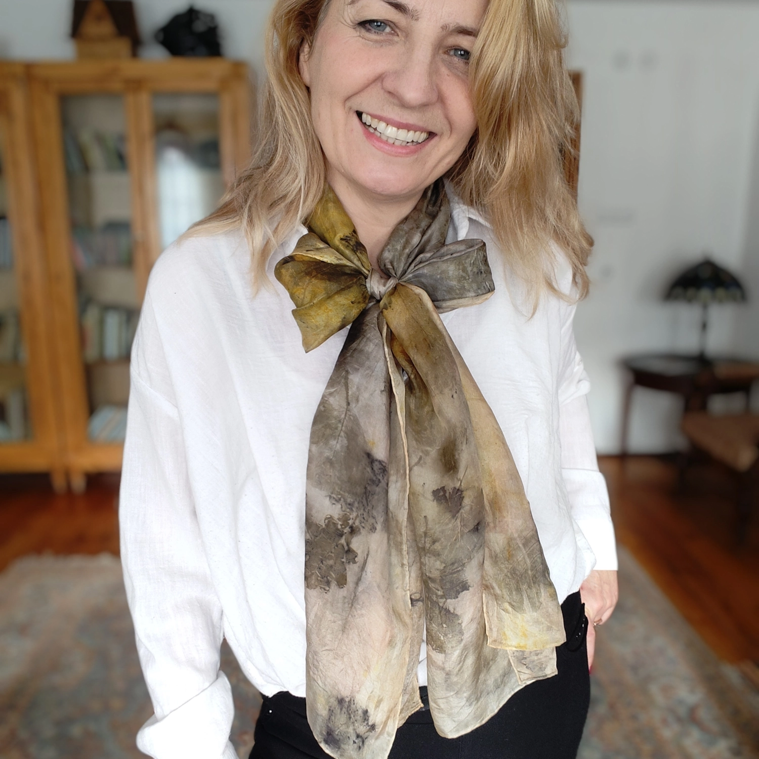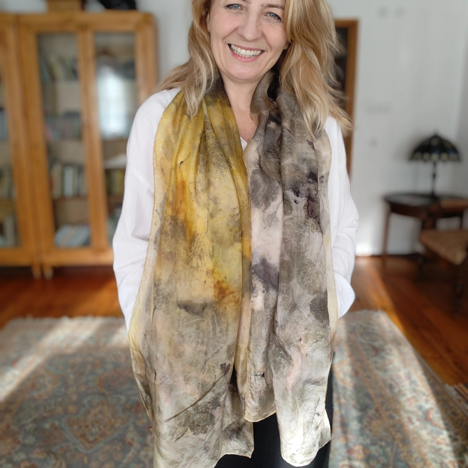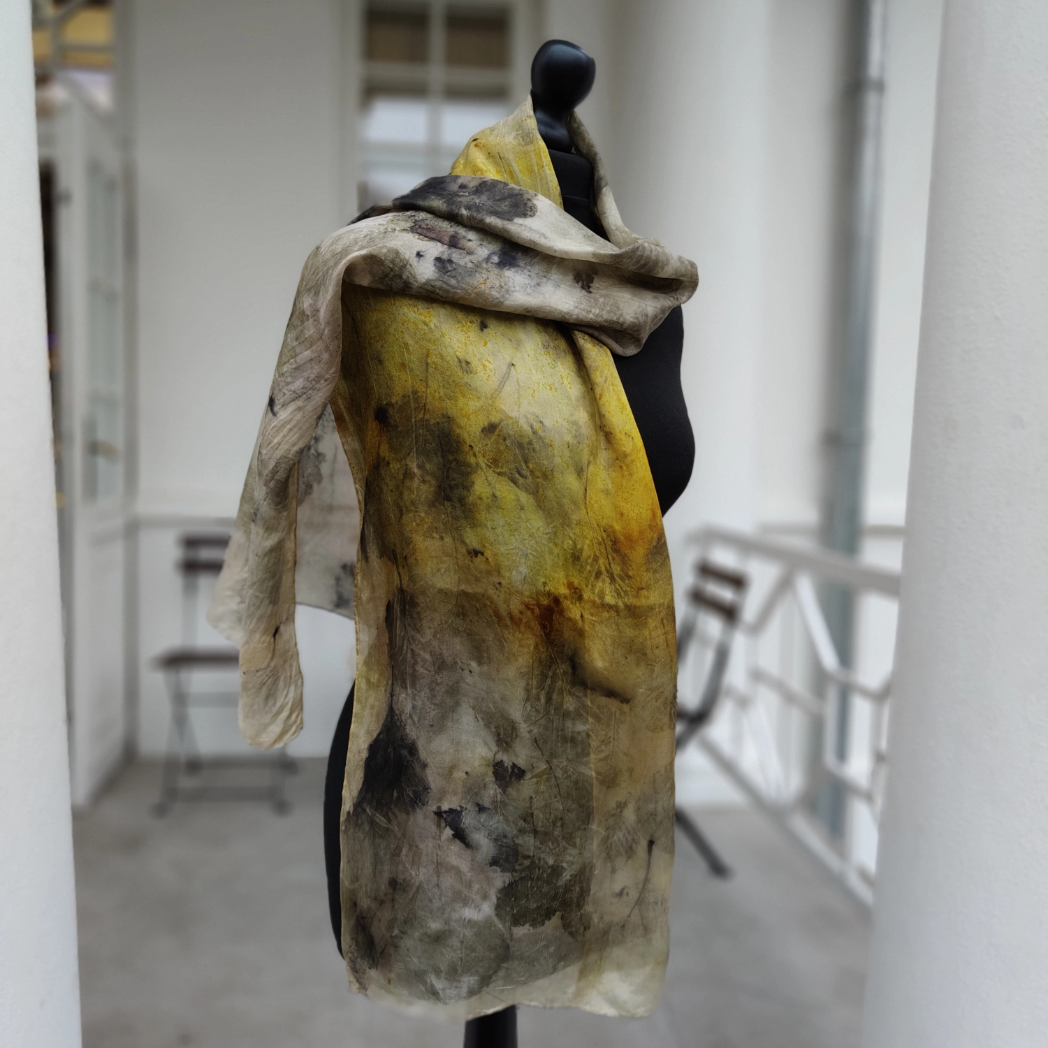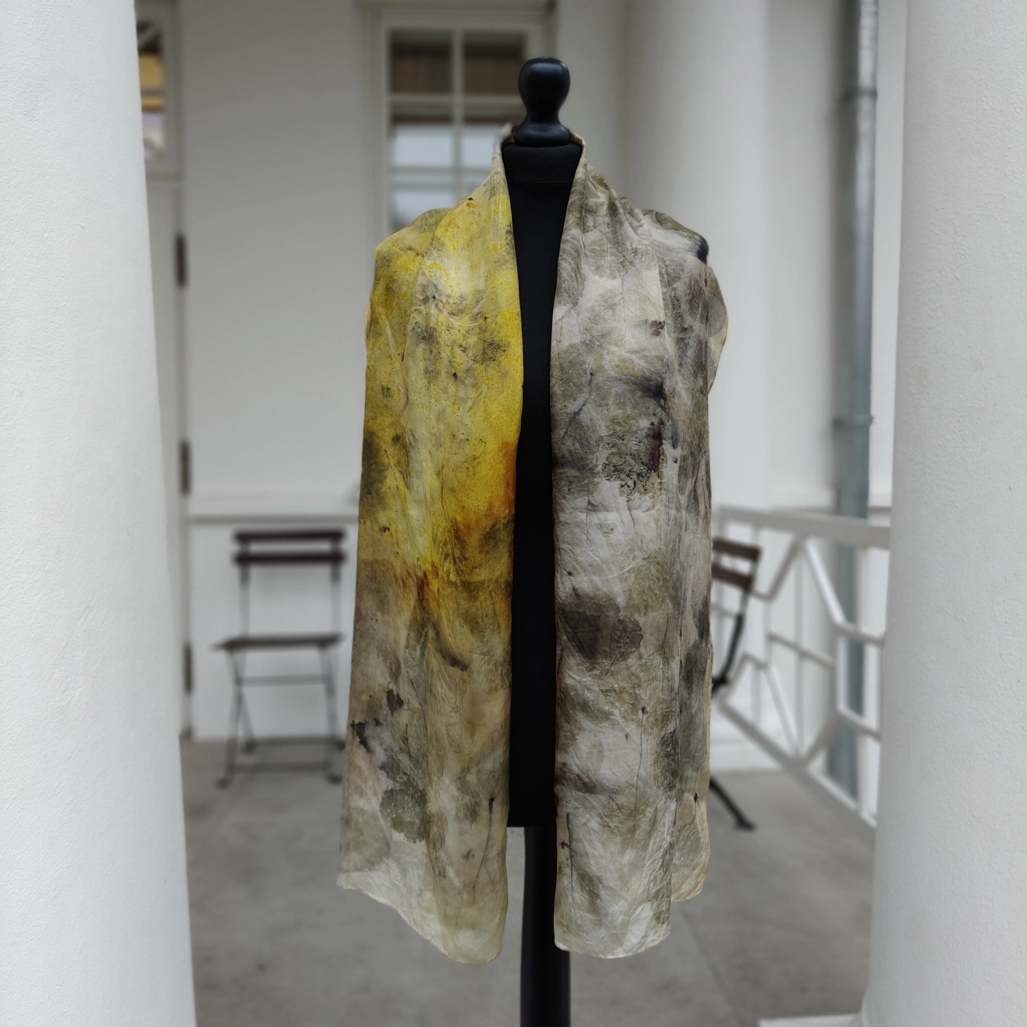 Wyjątkowy szal wykonany w 100% z jedwabiu naturalnego, cienki i długi z ecoprintem i pasem żółcieni. Można owinąć się dwa razy i mieć zawsze go przy sobie. Na różne okazje – na co dzień i na wydarzenia.