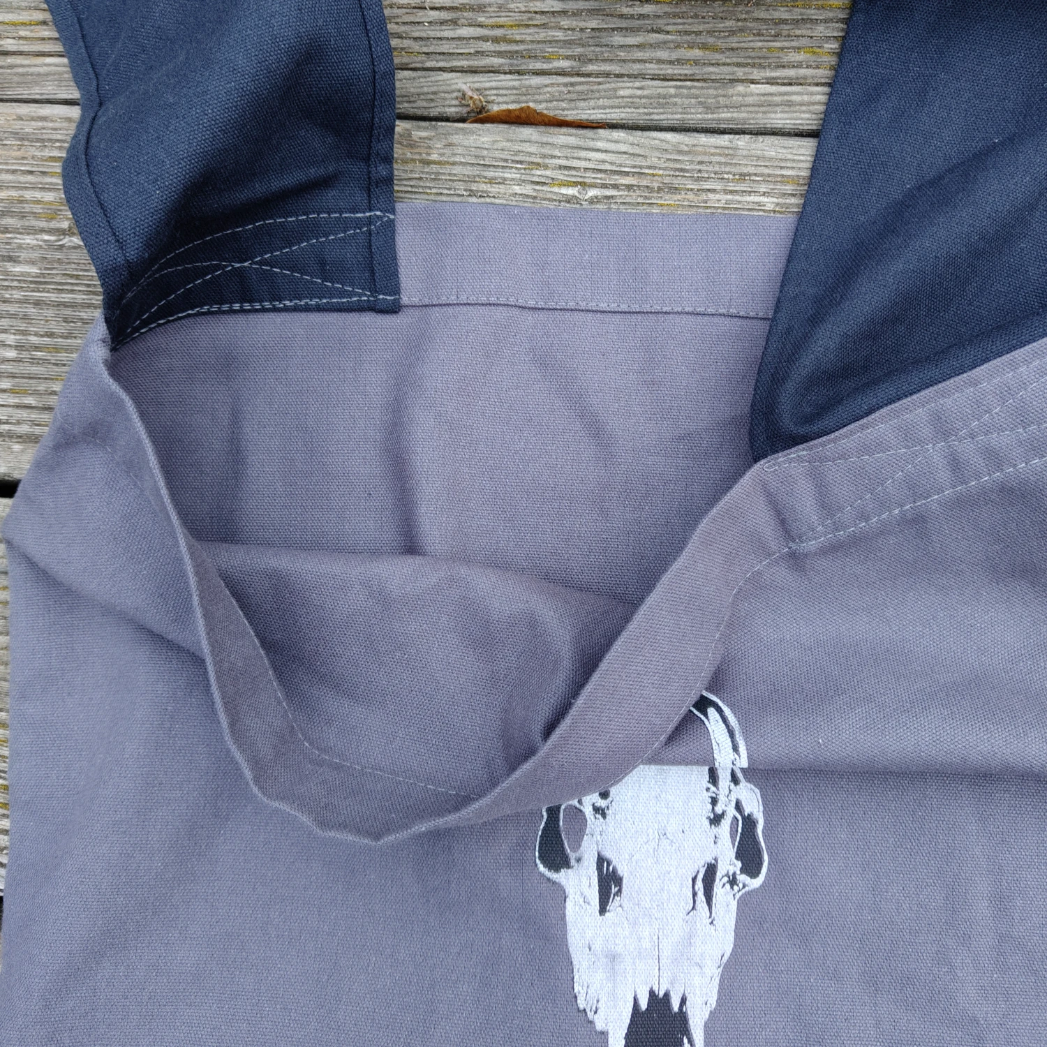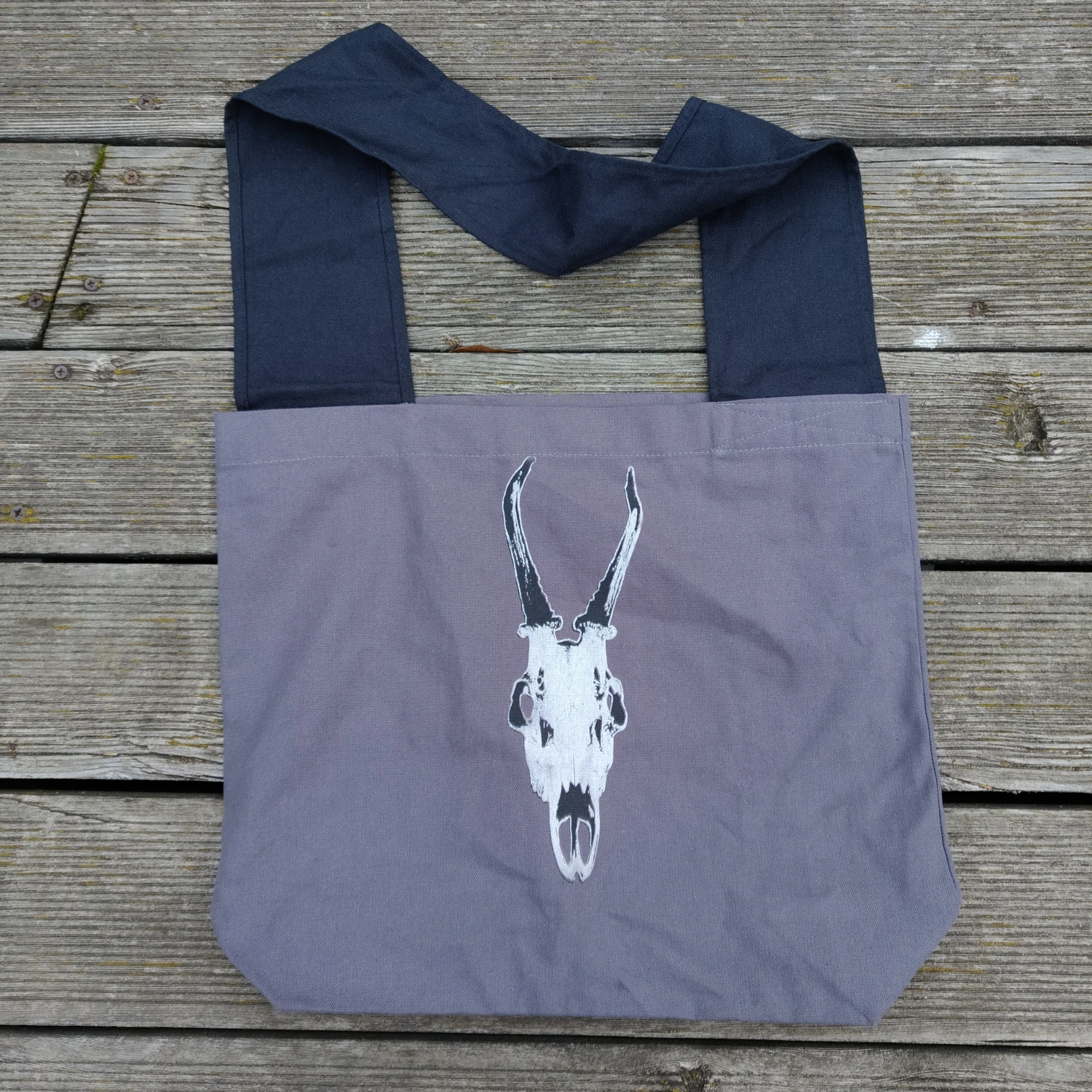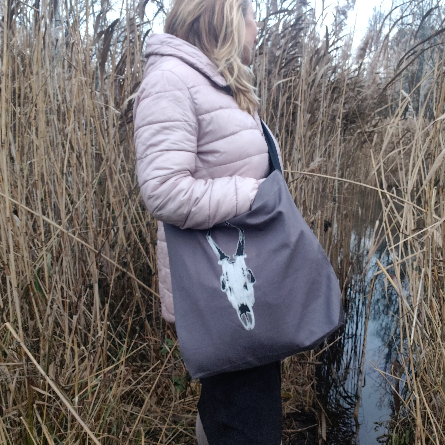 Oryginalna i ciekawa torba z sitodrukiem farbą wypukłą z czaszką sarny. Uszyta na bazie toreb noszonych przez tybetańskich mnichów.