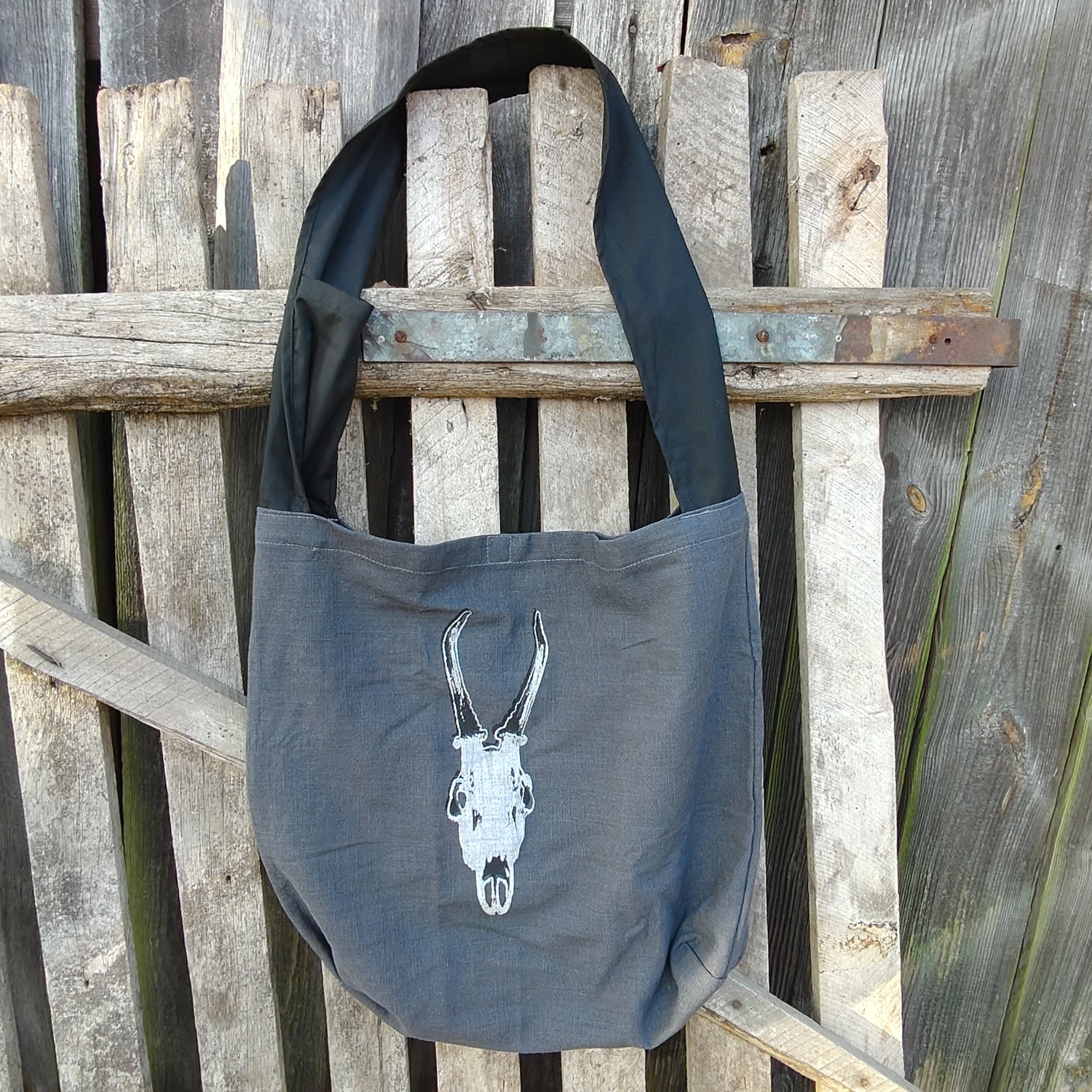 Oryginalna i ciekawa torba z sitodrukiem farbą wypukłą z czaszką sarny z jednej strony i z kostkami z drugiej. Na pasie znajduje się kieszonka na komórkę a w środku kieszonka na klucze. Torba uszyta na bazie toreb noszonych przez mnichów tybetańskich.