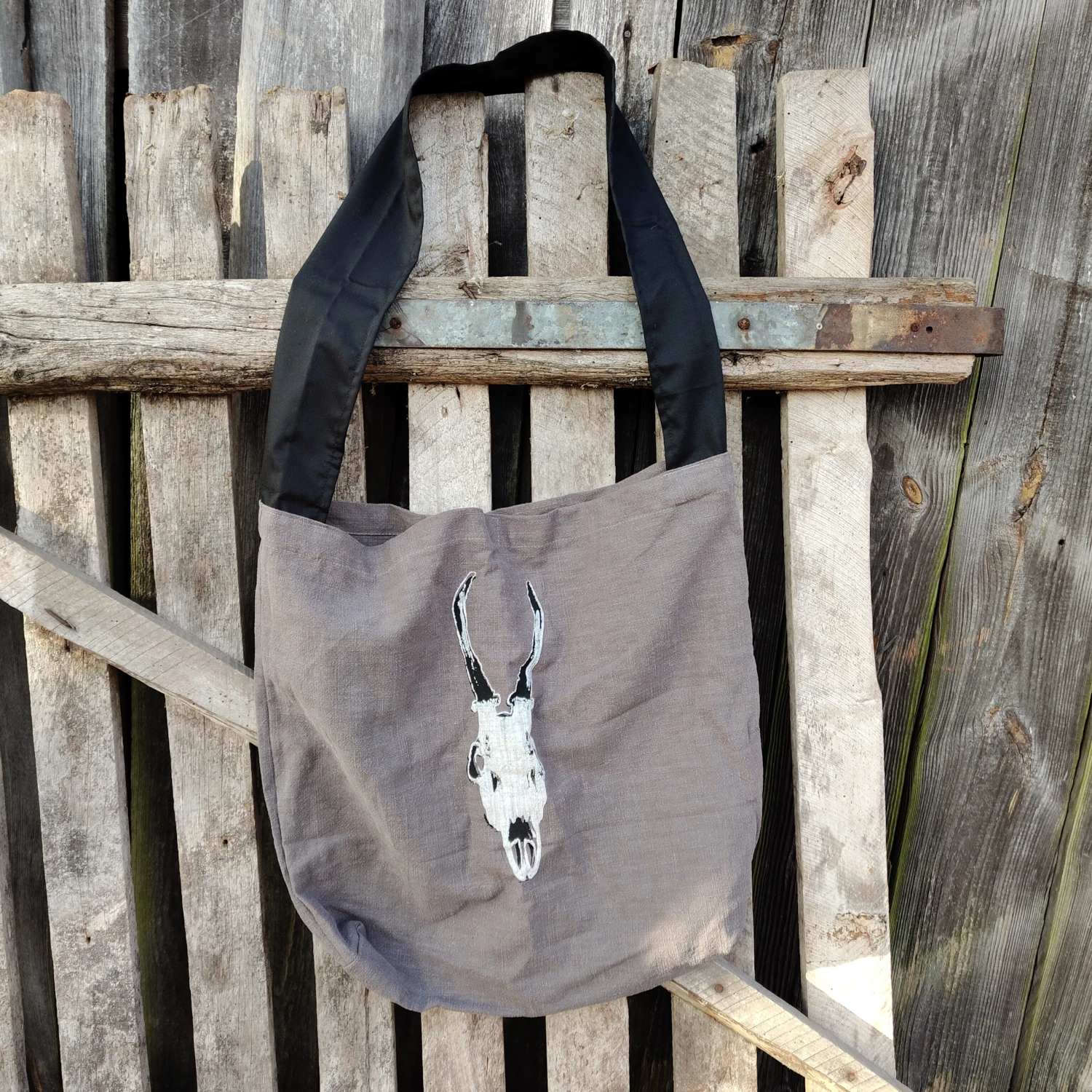 Oryginalna i ciekawa torba z sitodrukiem farbą wypukłą z czaszką sarny z jednej strony i z kostkami z drugiej. Na pasie znajduje się kieszonka na komórkę a w środku kieszonka na klucze. Torba uszyta na bazie toreb noszonych przez mnichów tybetańskich.
